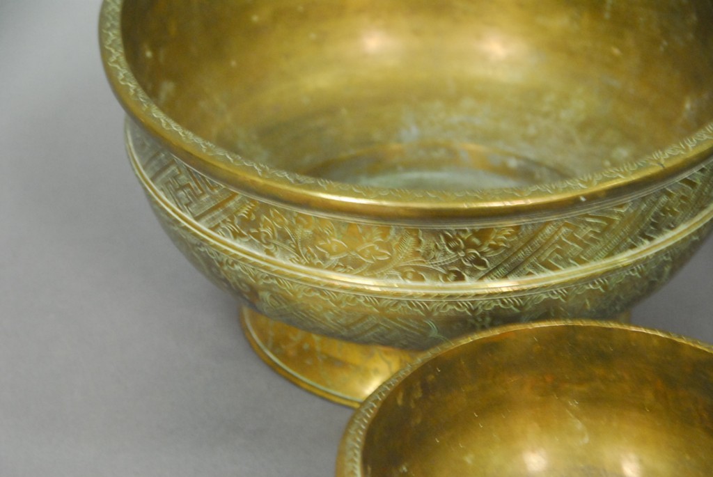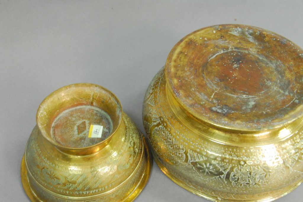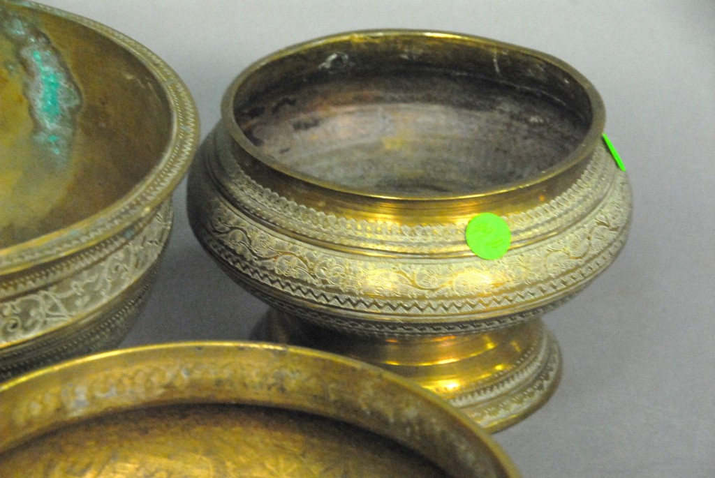 Group of five early brass footed bowls, probably mideastern 18th century or earlier. – ht. 4in. – 6in. wd. 6 1/2in. – 10 1/2in.