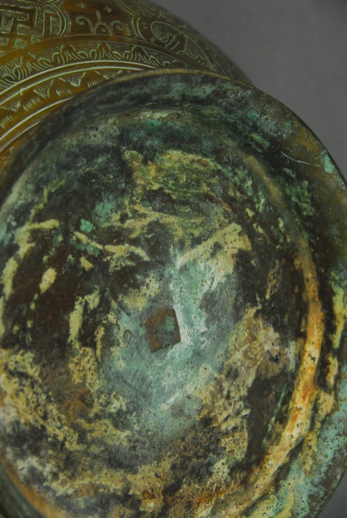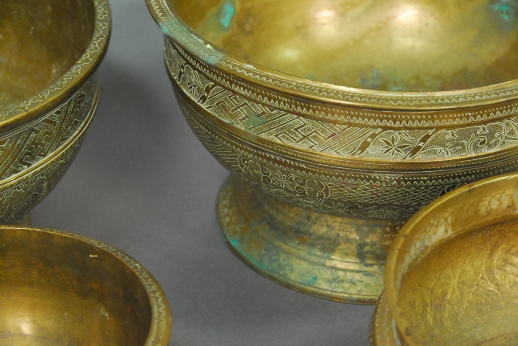 Lot 654: Group of five early brass footed bowls, probably mideastern 18th century or earlier