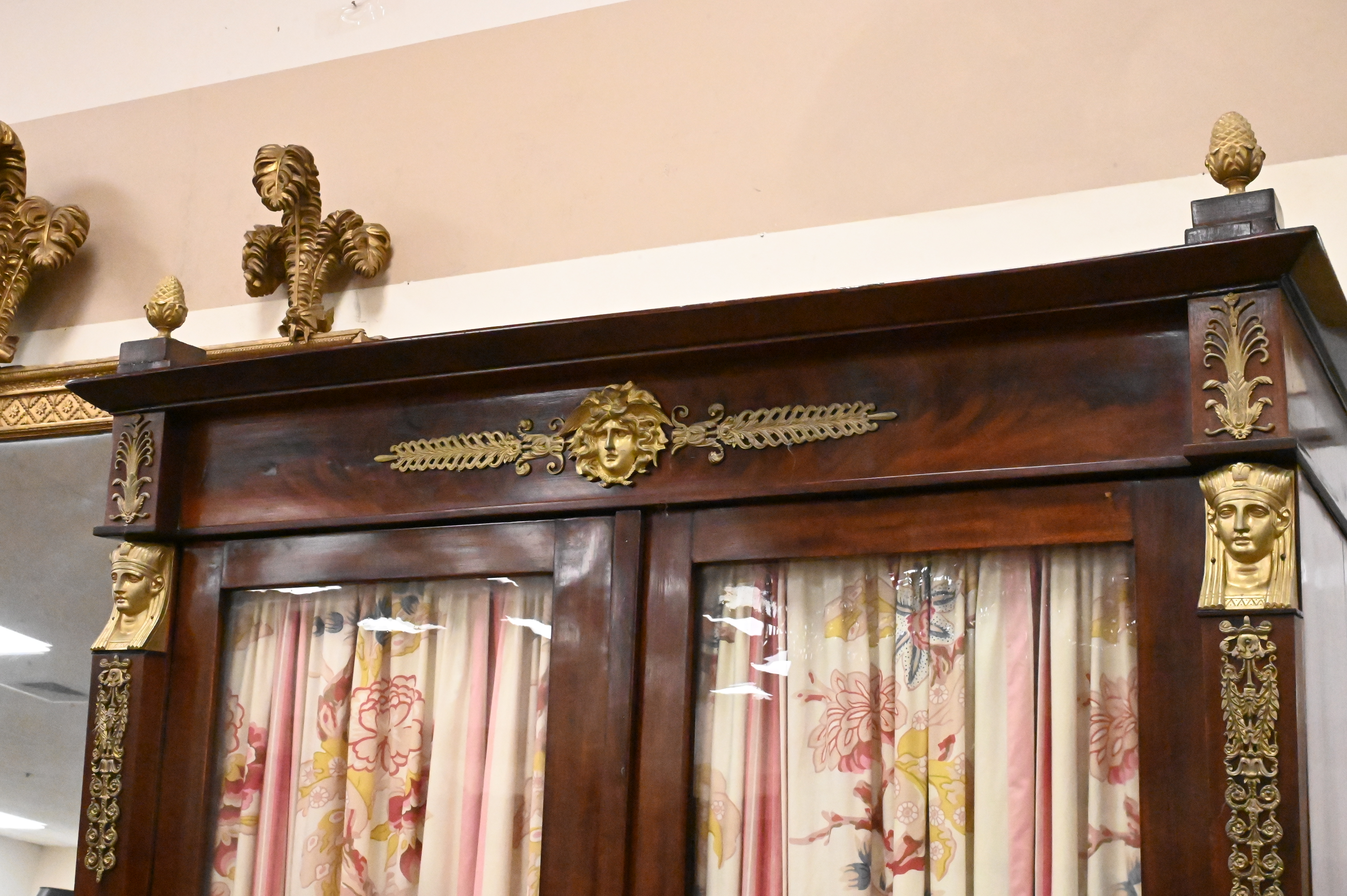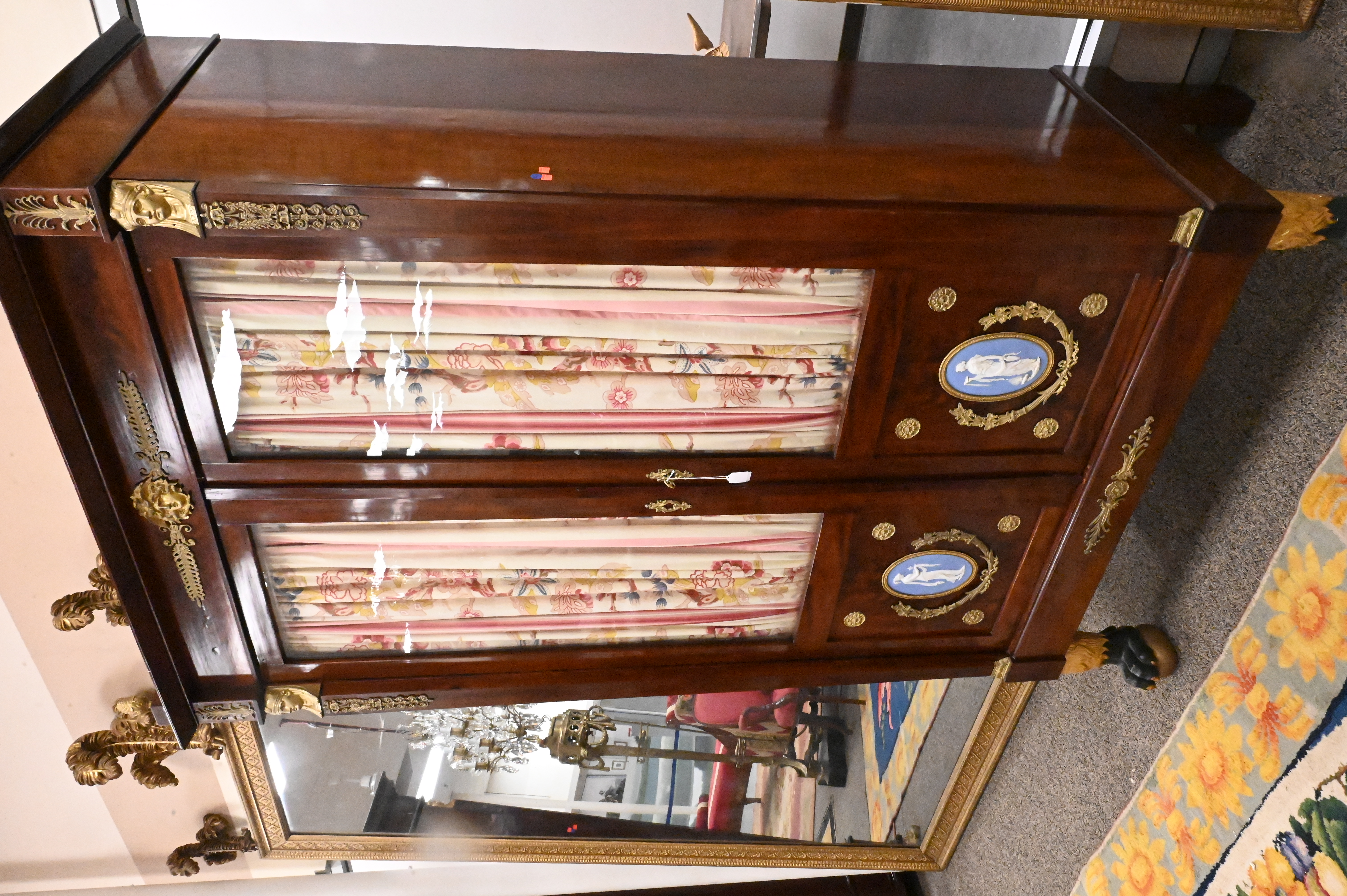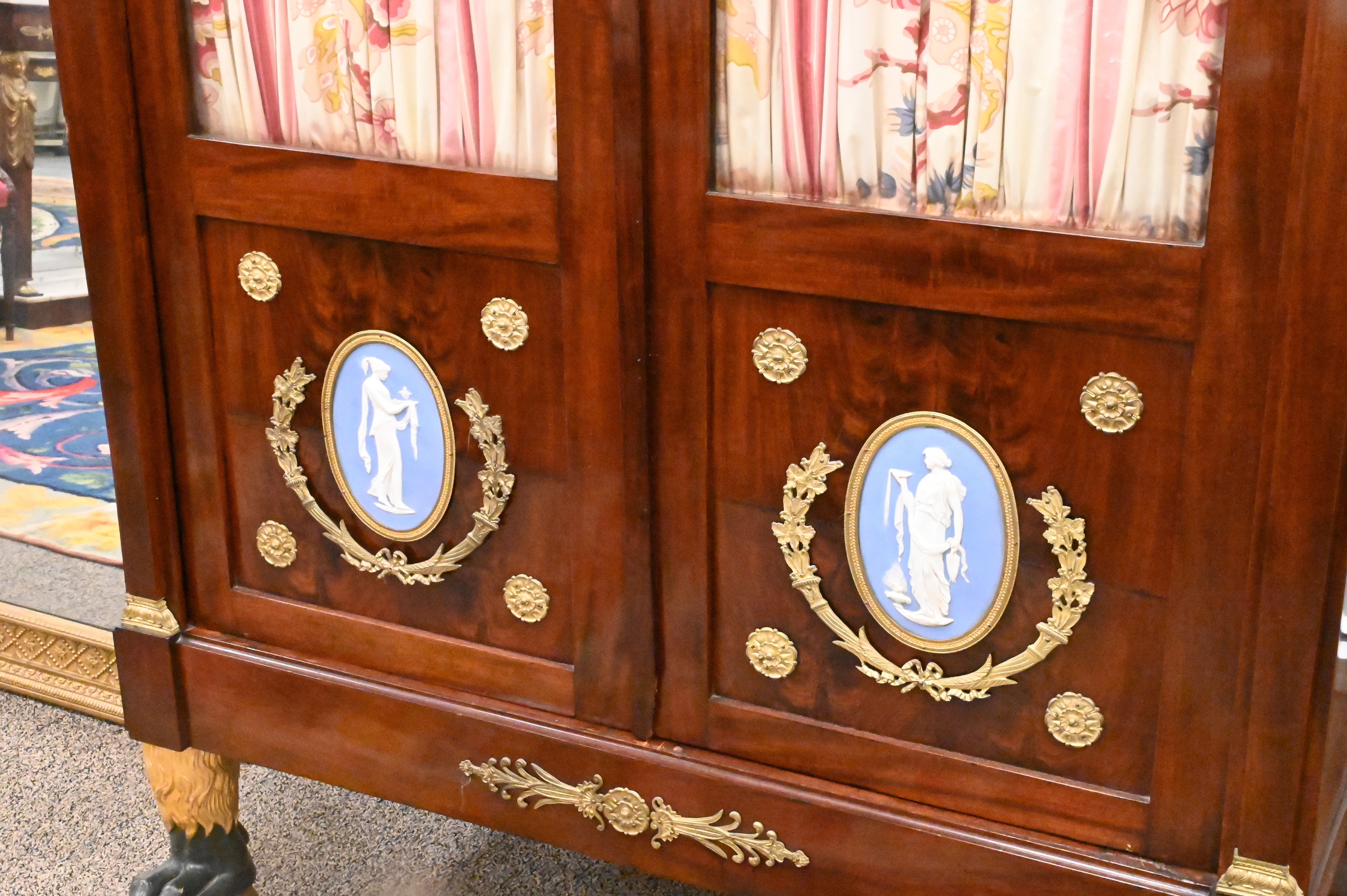 having a projecting pediment with pine cone finials, over two glazed doors enclosing shelves, the lower portion inset with jasperware-type plaques, on gilt and ebonized paw feet, flanked by pilasters headed by Egyptian masks, mid-19th century