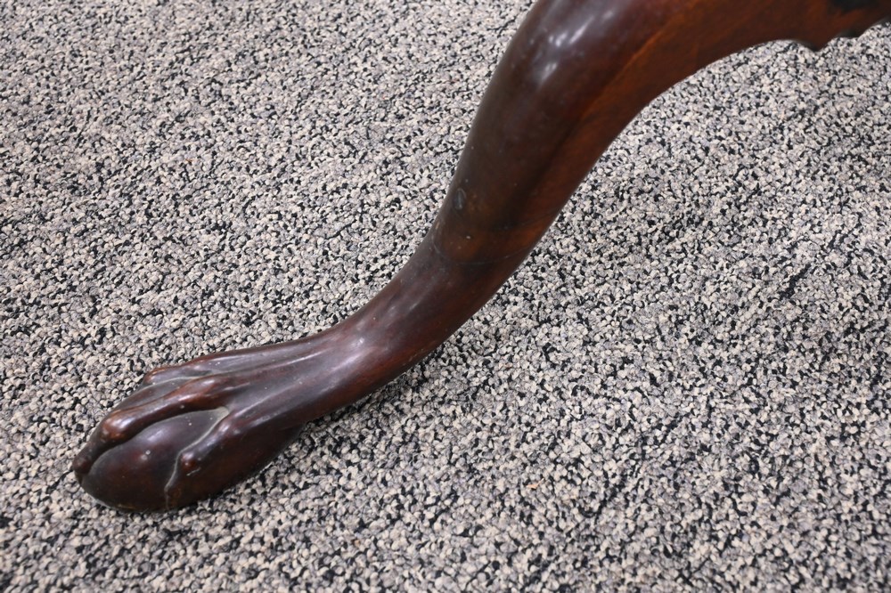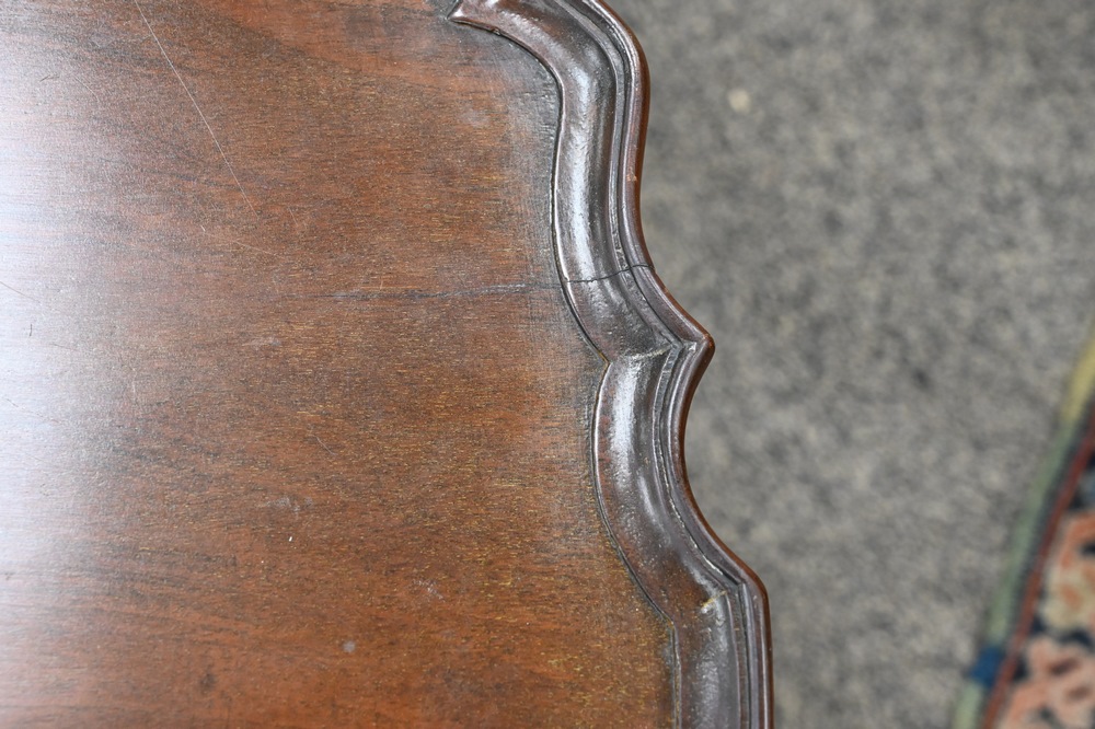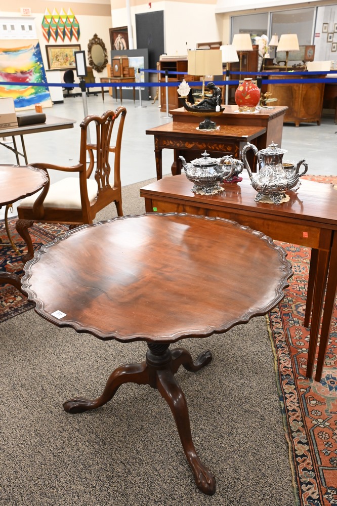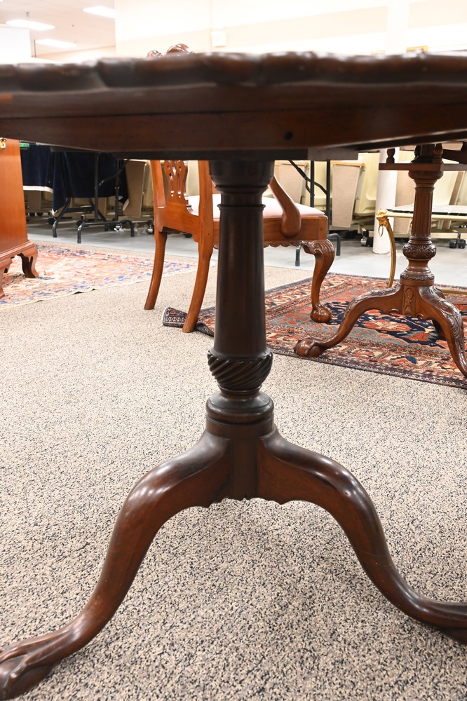 Lot 655: Chippendale Mahogany Piecrust Tip Table on Pedestal, having carved urn on tripod base with ball and claw feet, height 28 inches, dia…