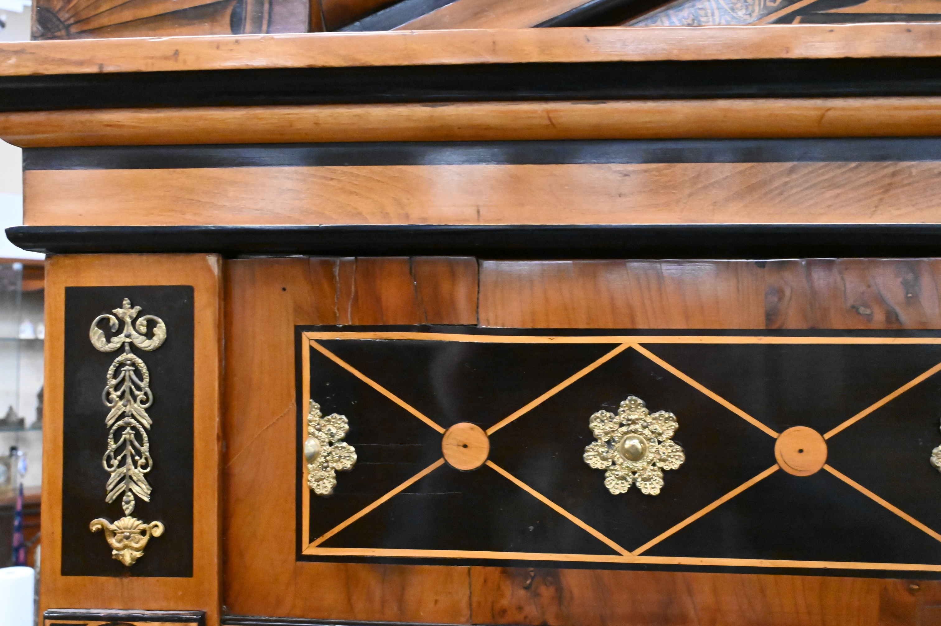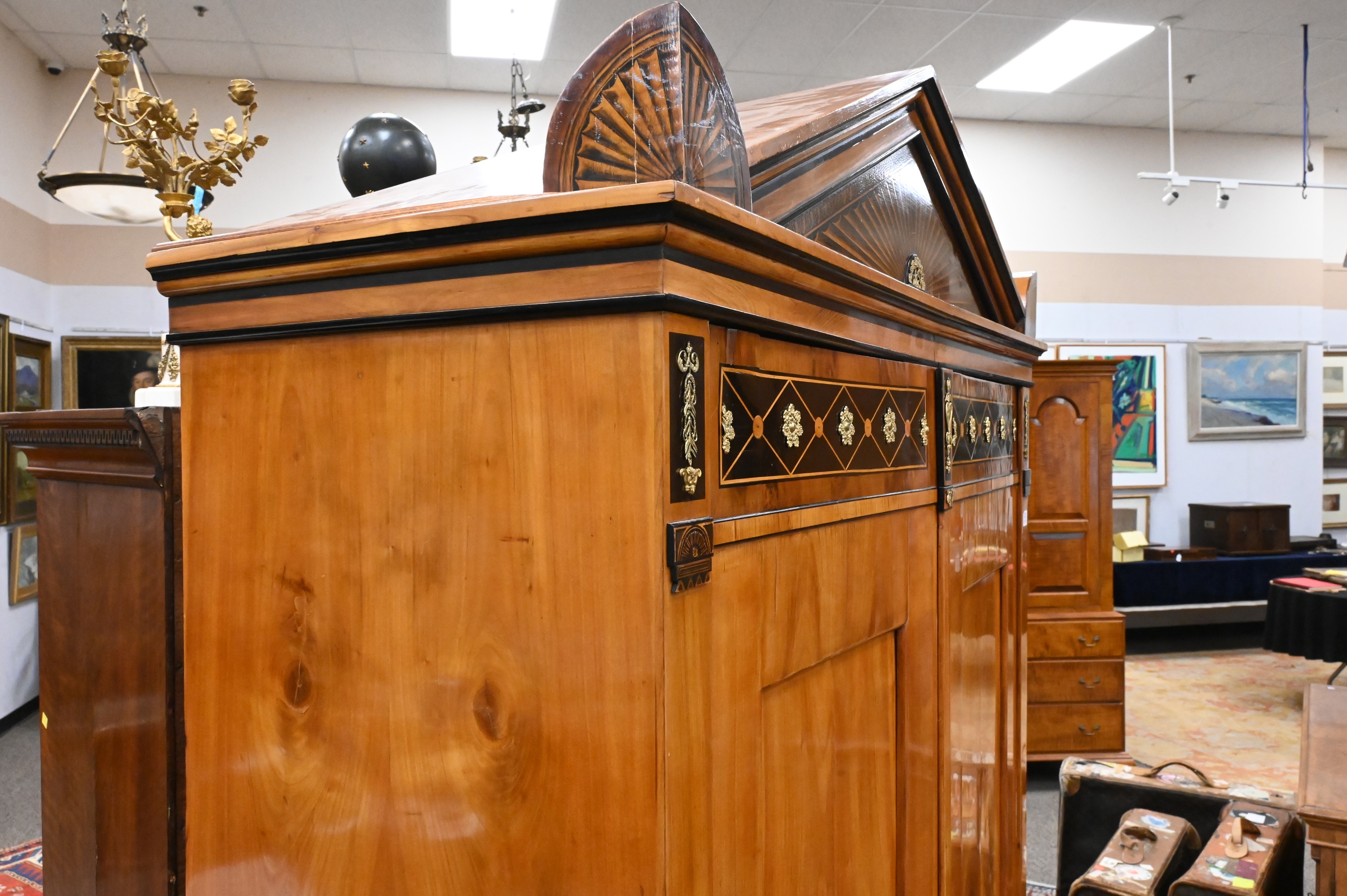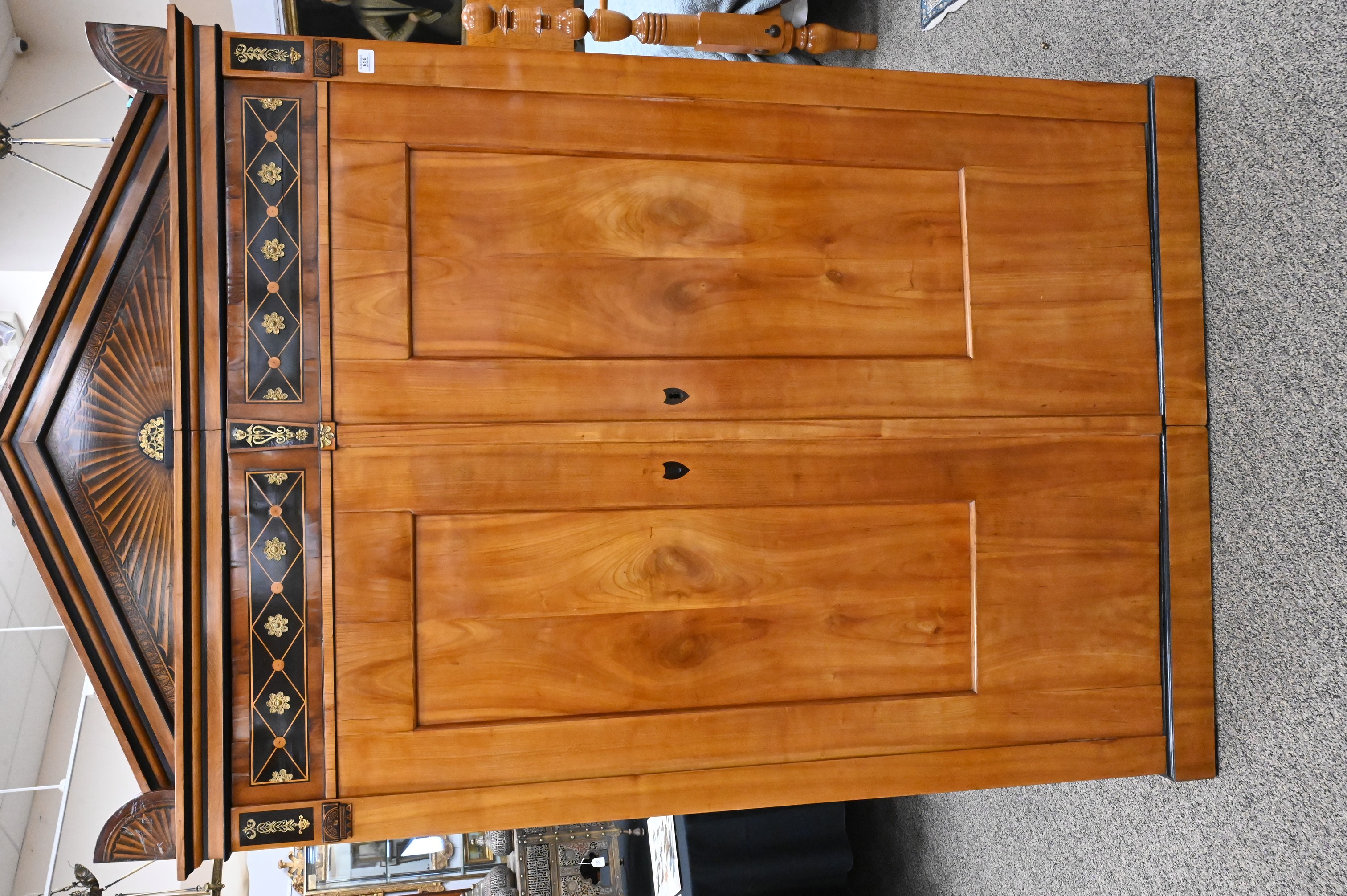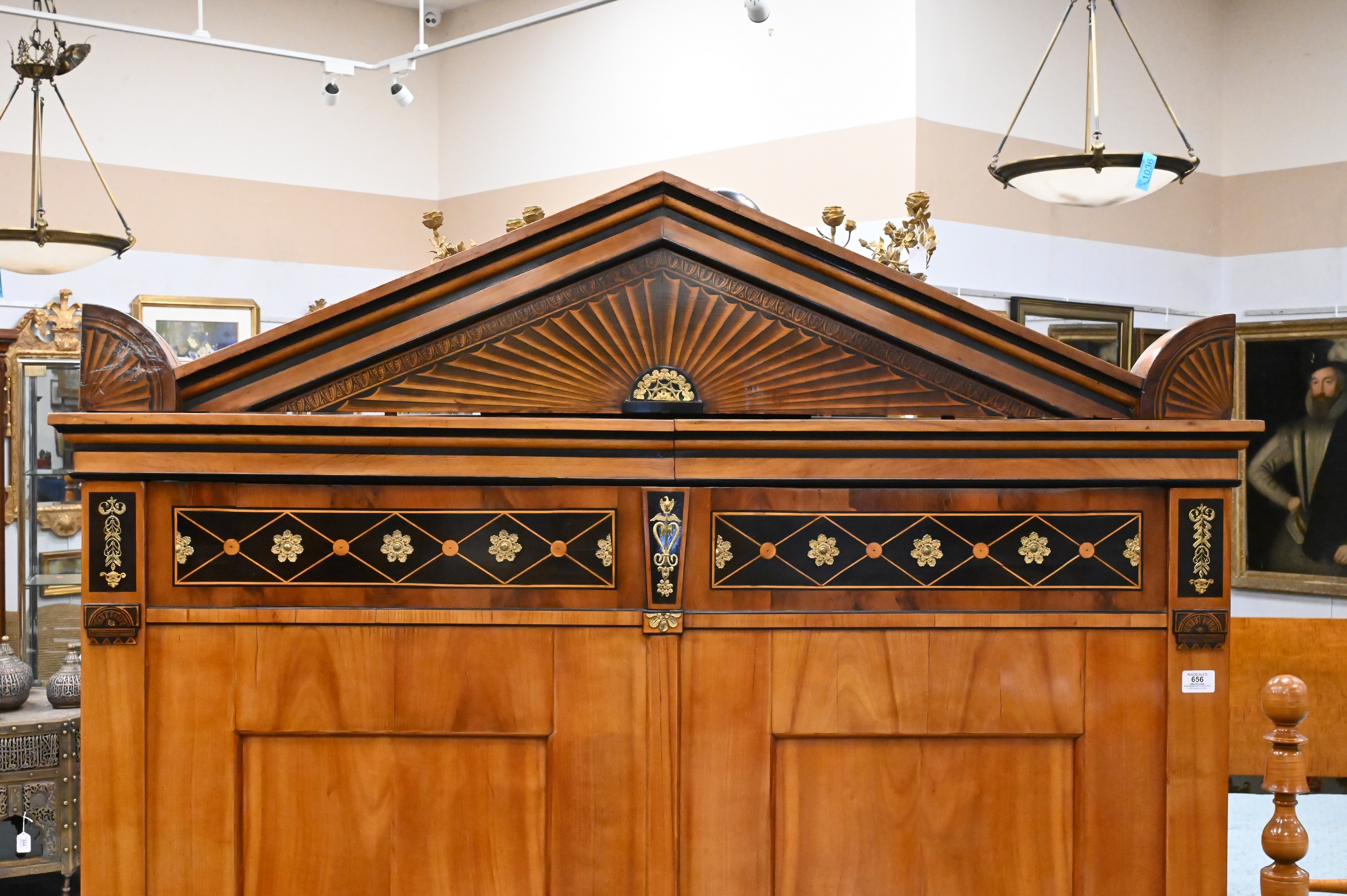 having inlaid pediment top with gilt bronze mount over two doors with inlaid panels and gilt bronze mounts, Vienna circa 1820