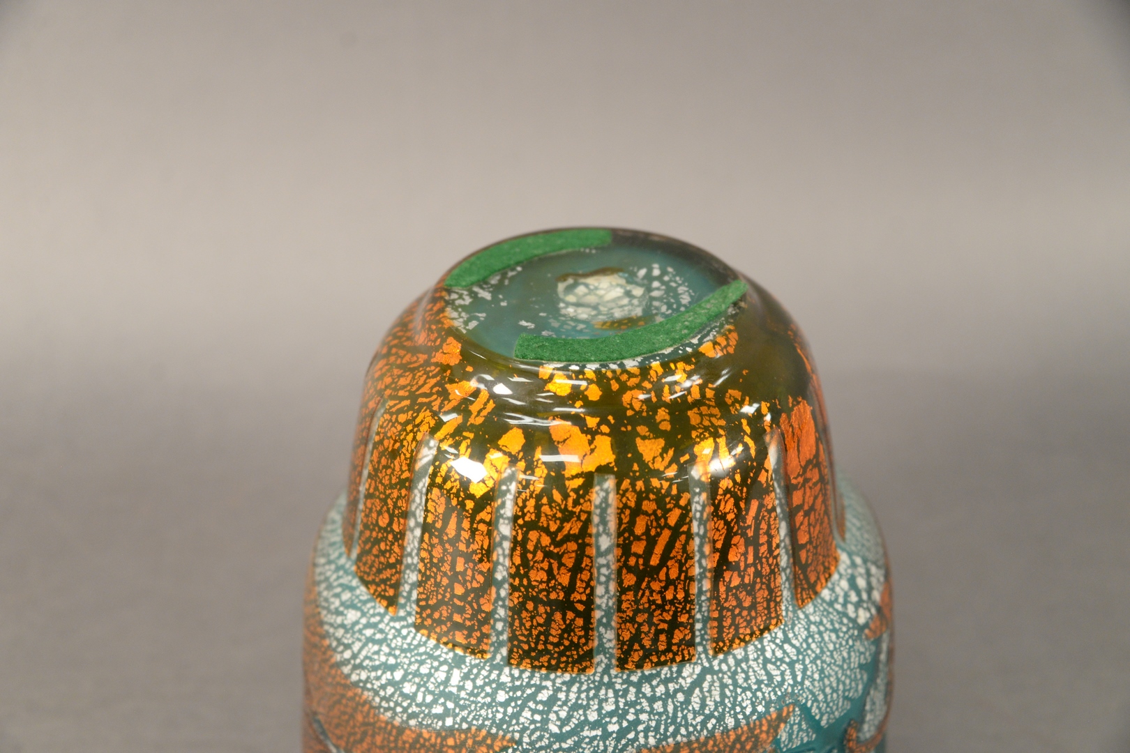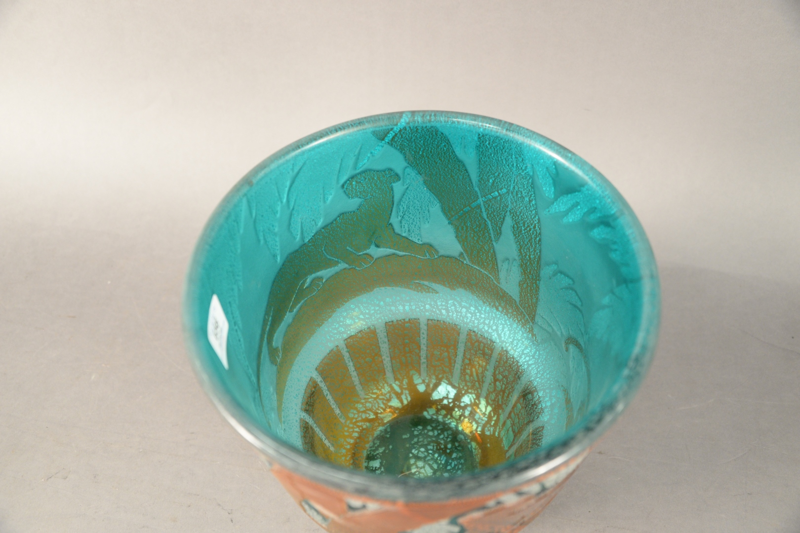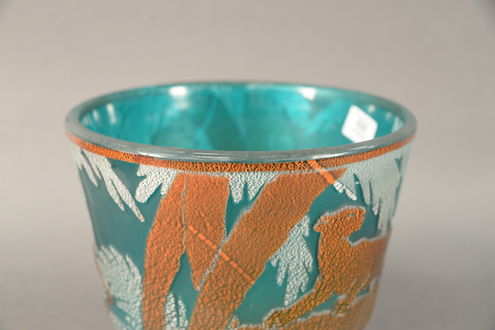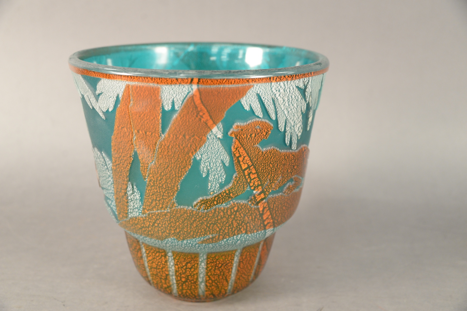 Lot 656: Large Muller Freres Luneville Blue and Yellow Mica Decorated Vase, having tiger motif, height 10 1/2 inches, diameter 10 1/4 inches.
