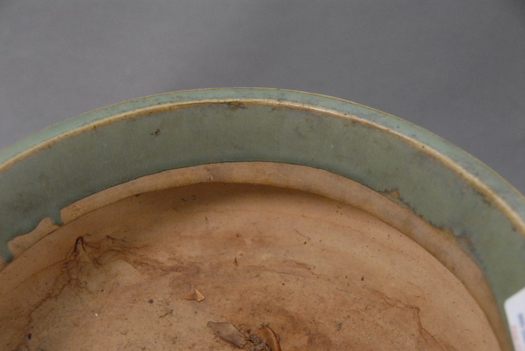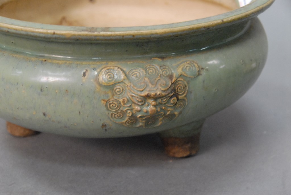 Lot 656: Ming Dynasty celadon green glazed earthenware bowl with foo dog handles. ht. 6in. dia. 11 1/2in.