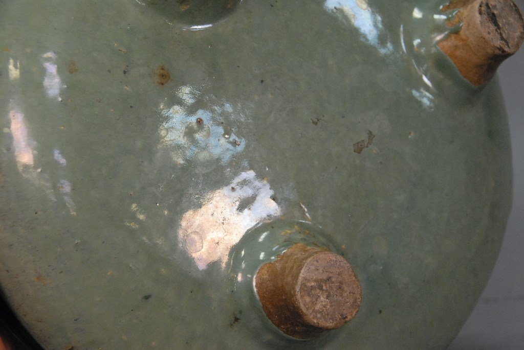 Ming Dynasty celadon green glazed earthenware bowl with foo dog handles. ht. 6in. dia. 11 1/2in.