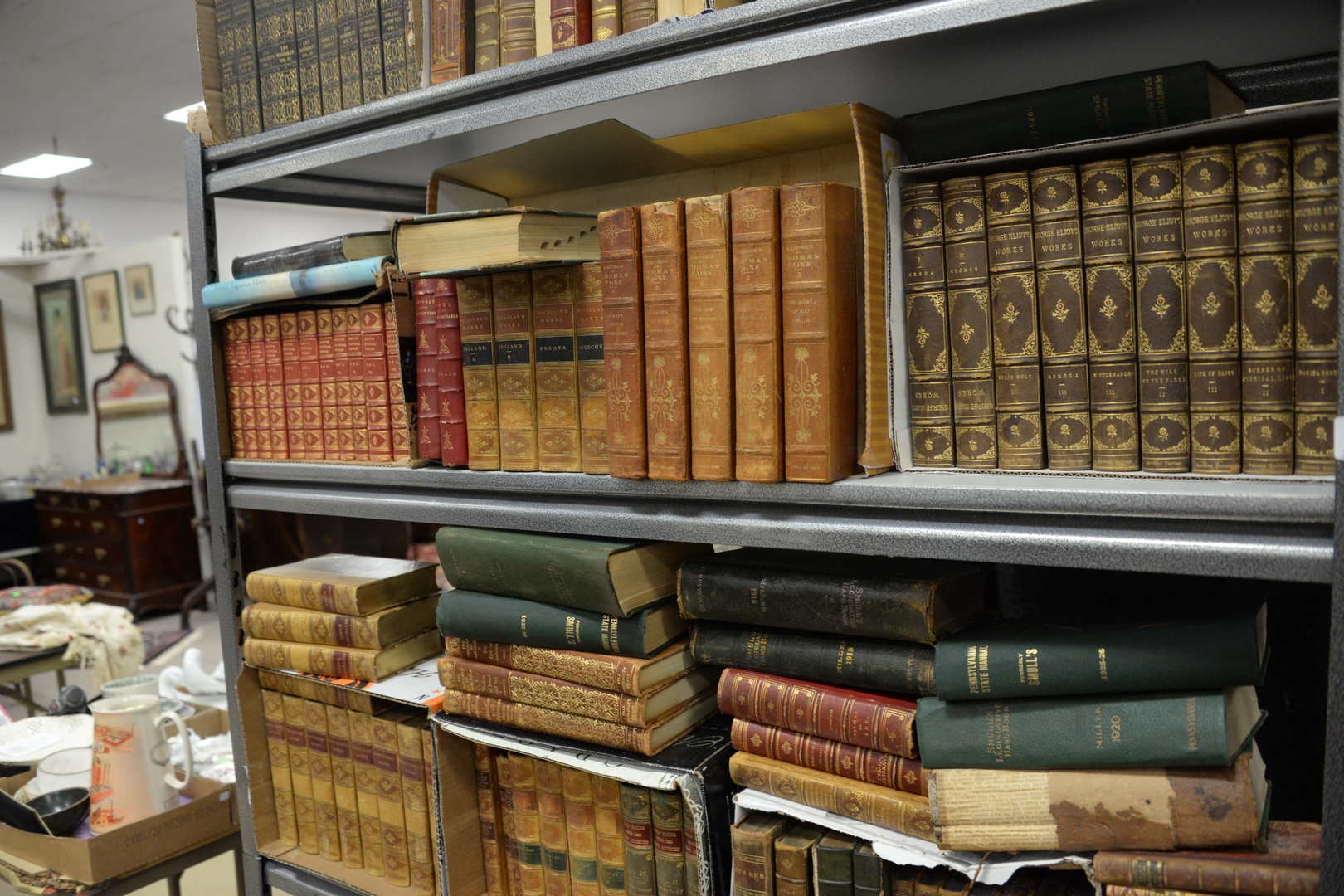 Lot 657: 25 boxes of 19th Century Leather Bound Books, included George Eliots works, Hawthorn, Thackeray, Hugo, Harvard, etc.
