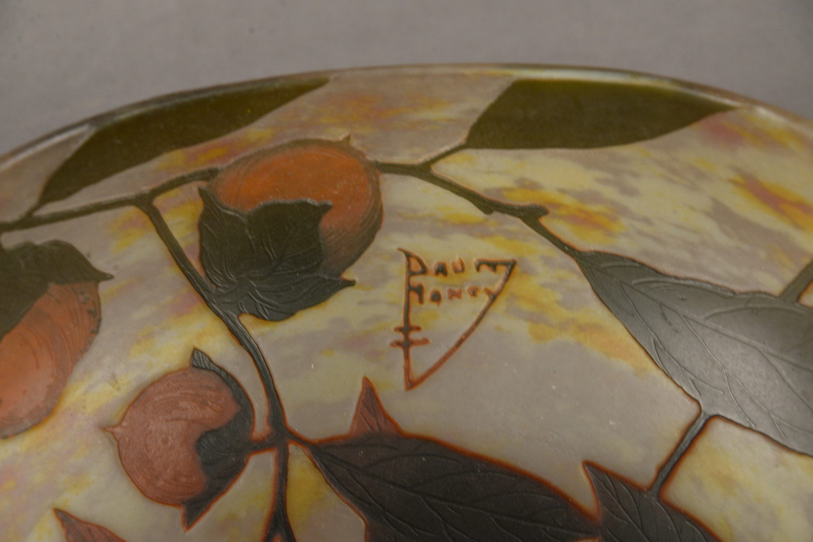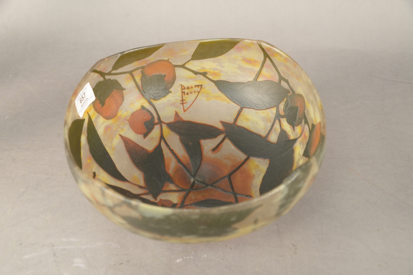 Lot 657: Large Daum Nancy Orange Blossom Cameo Glass Bowl, raised on footed base, marked Daum Nancy, height 6 1/2 inches, diameter 11 1/2 i…