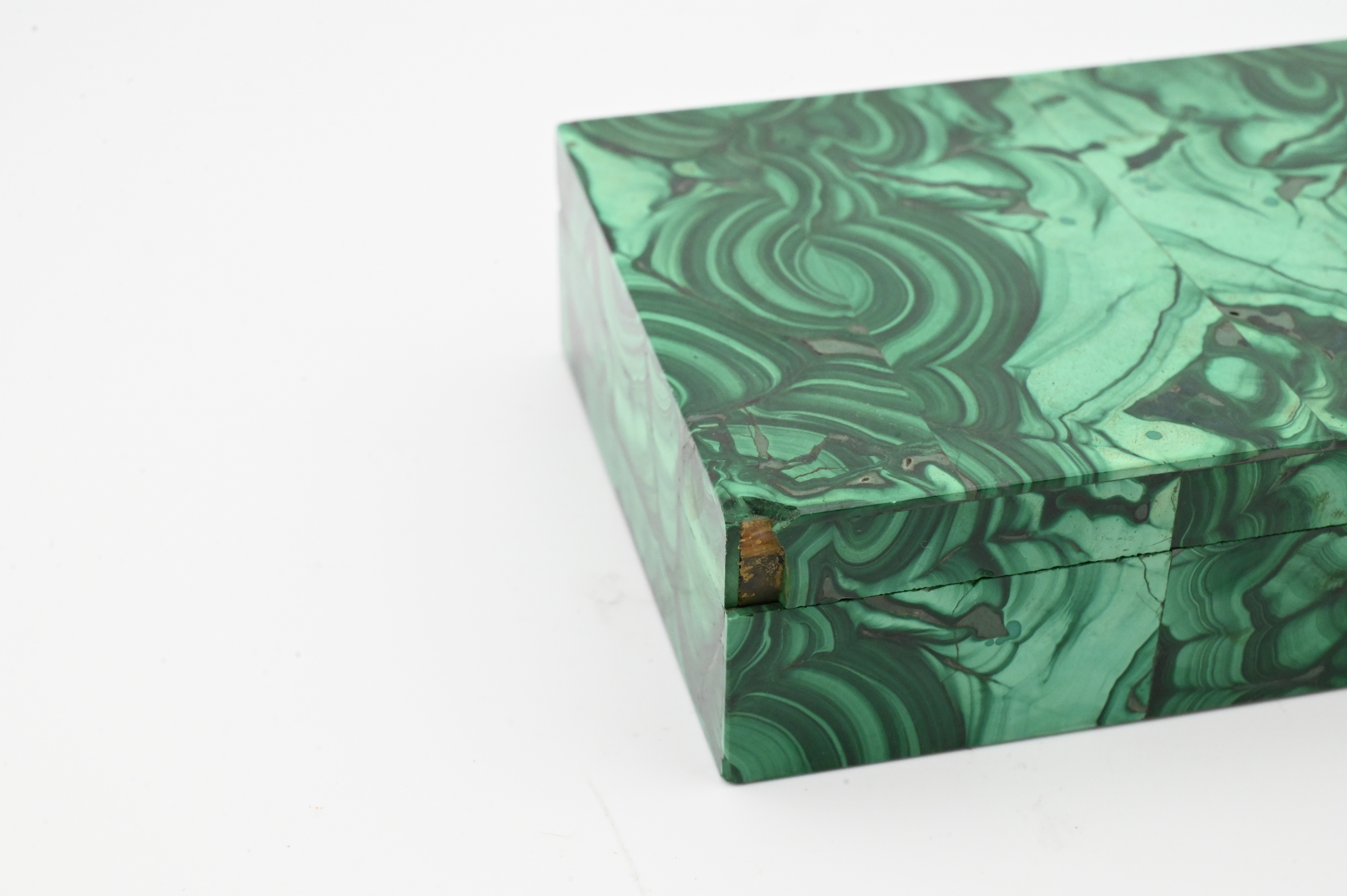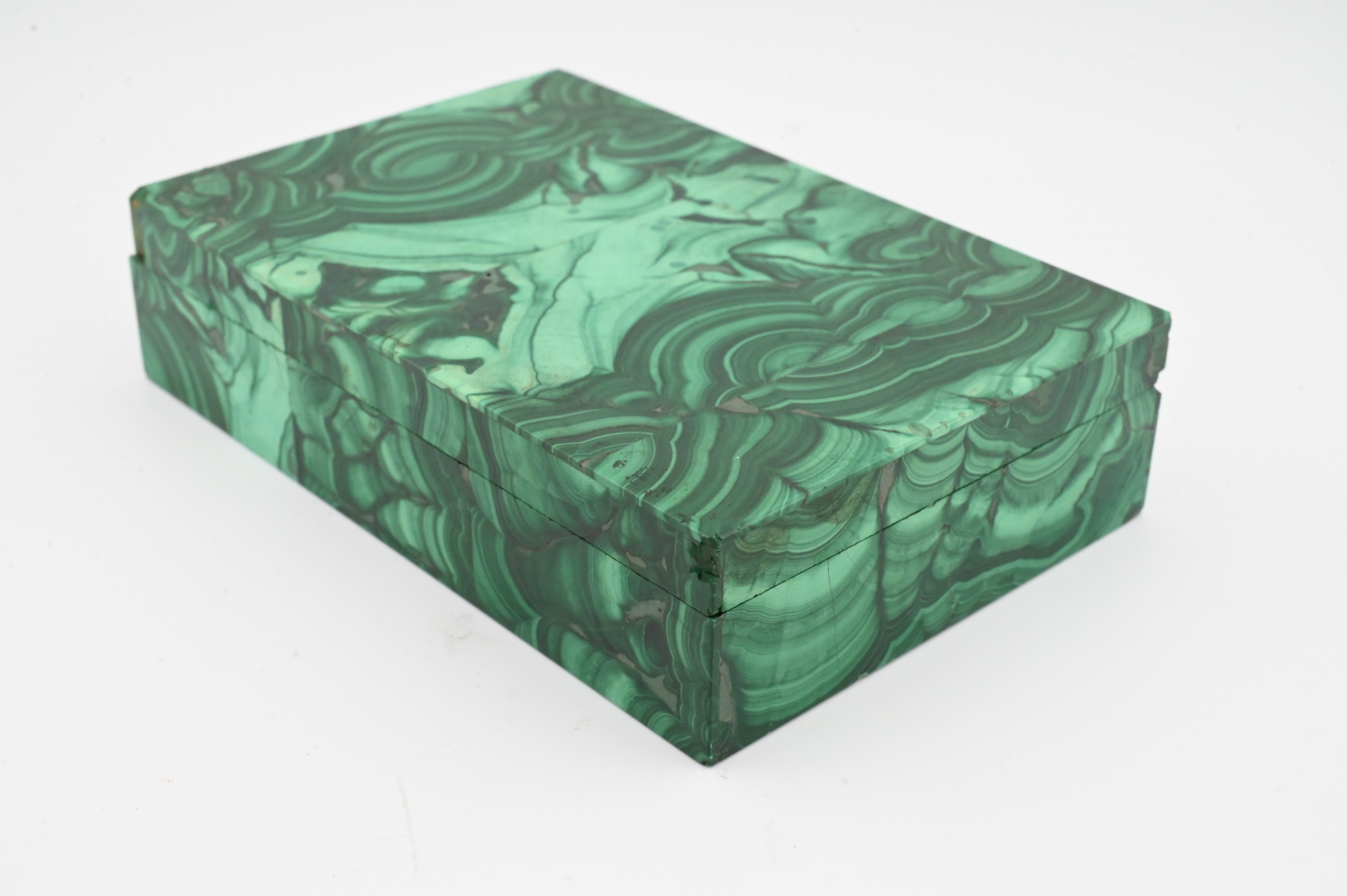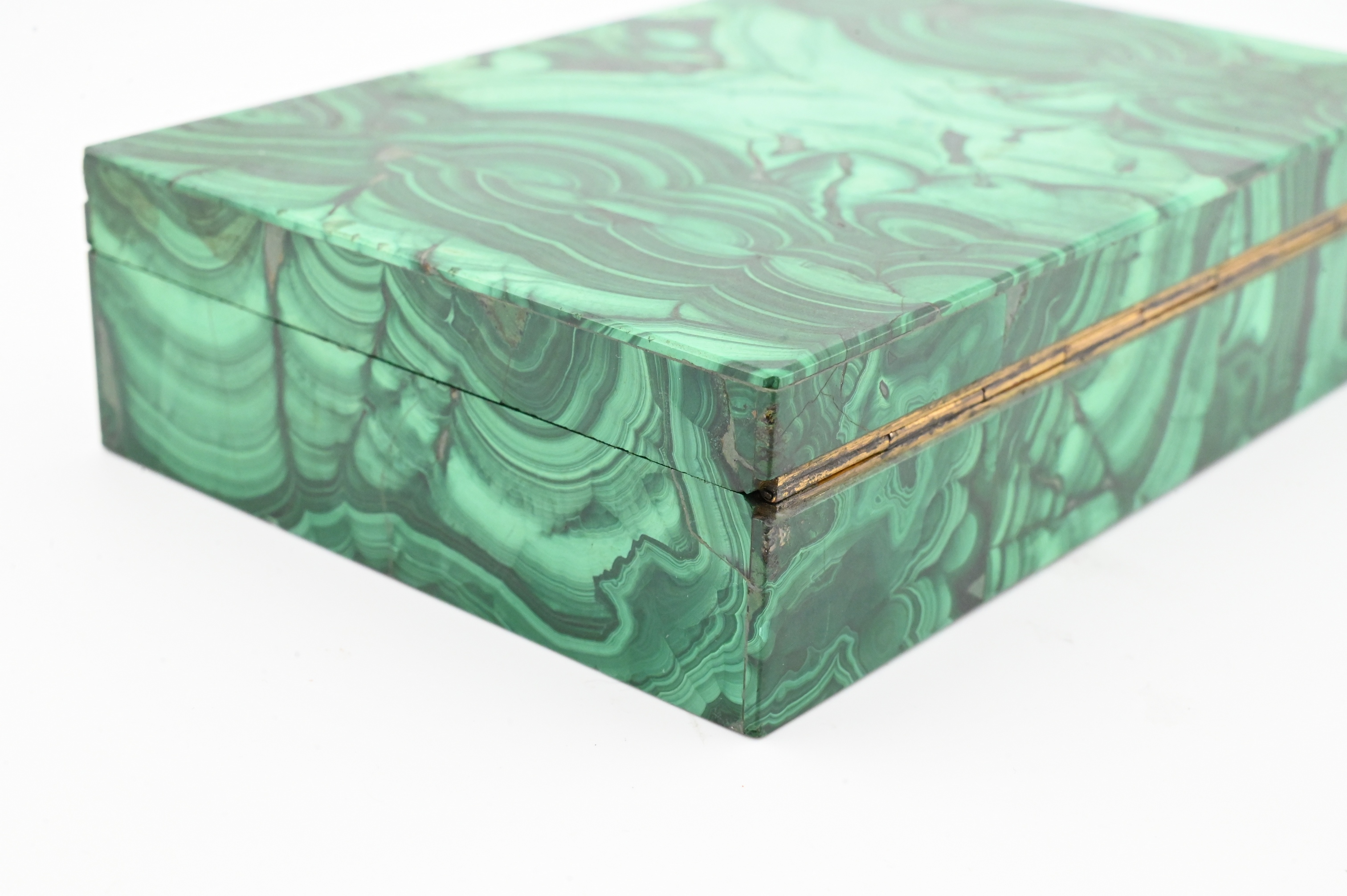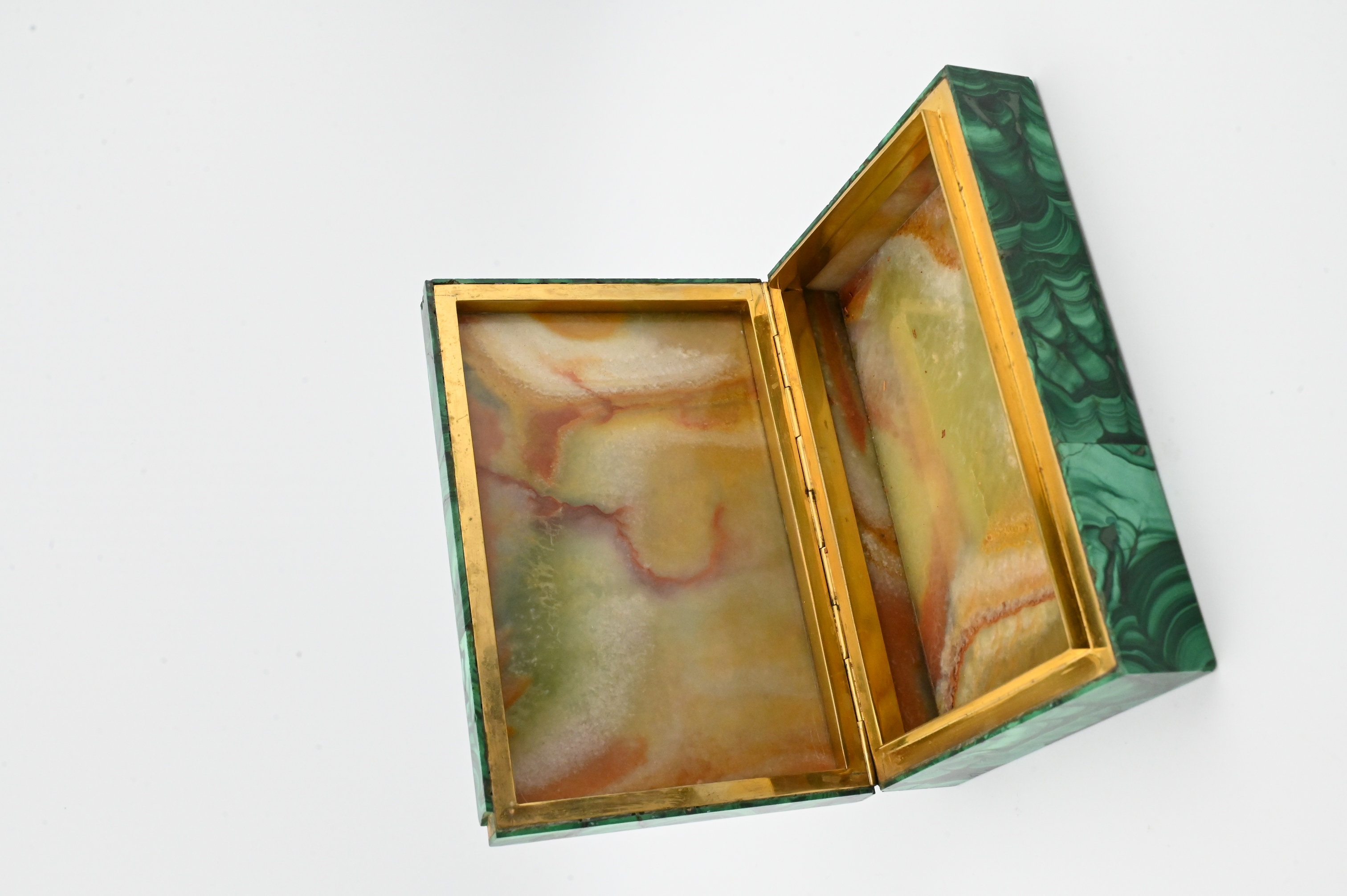 finely made rectangular malachite box, the hinged lid and sides veneered with richly banded green malachite panels displaying concentric swirling patterns, the interior lined with polished onyx marble panels of variegated cream, orange, and green tones, framed with a gilt-metal border, a decorative and functional piece, suitable for use as a jewelry or trinket box