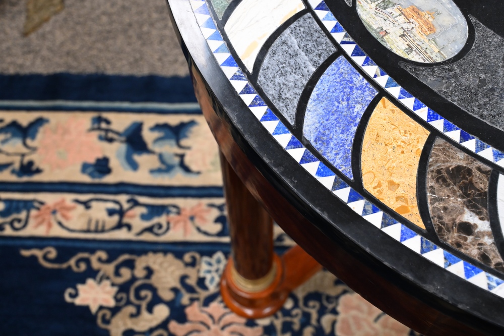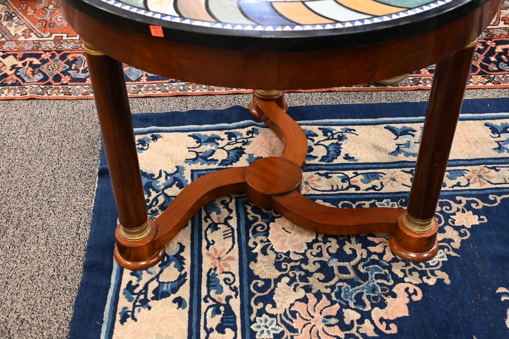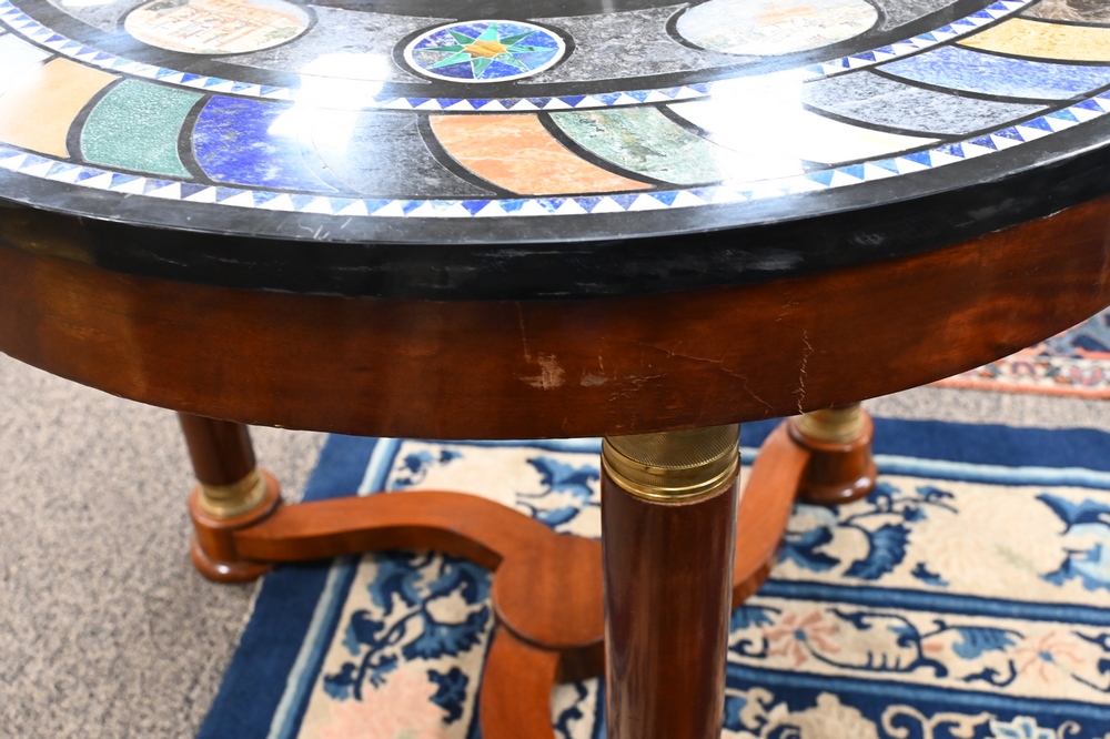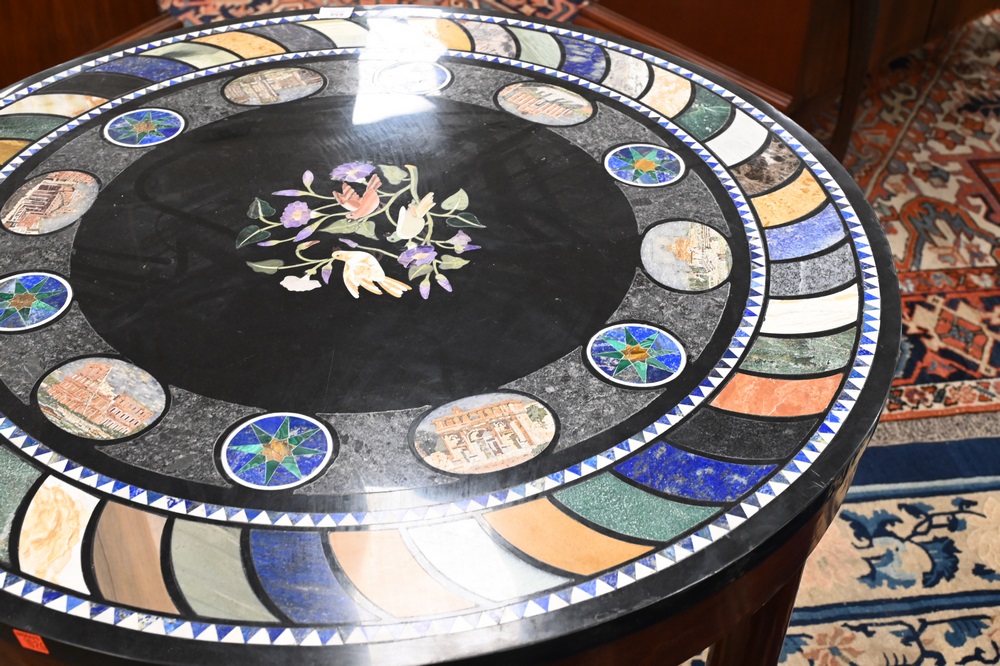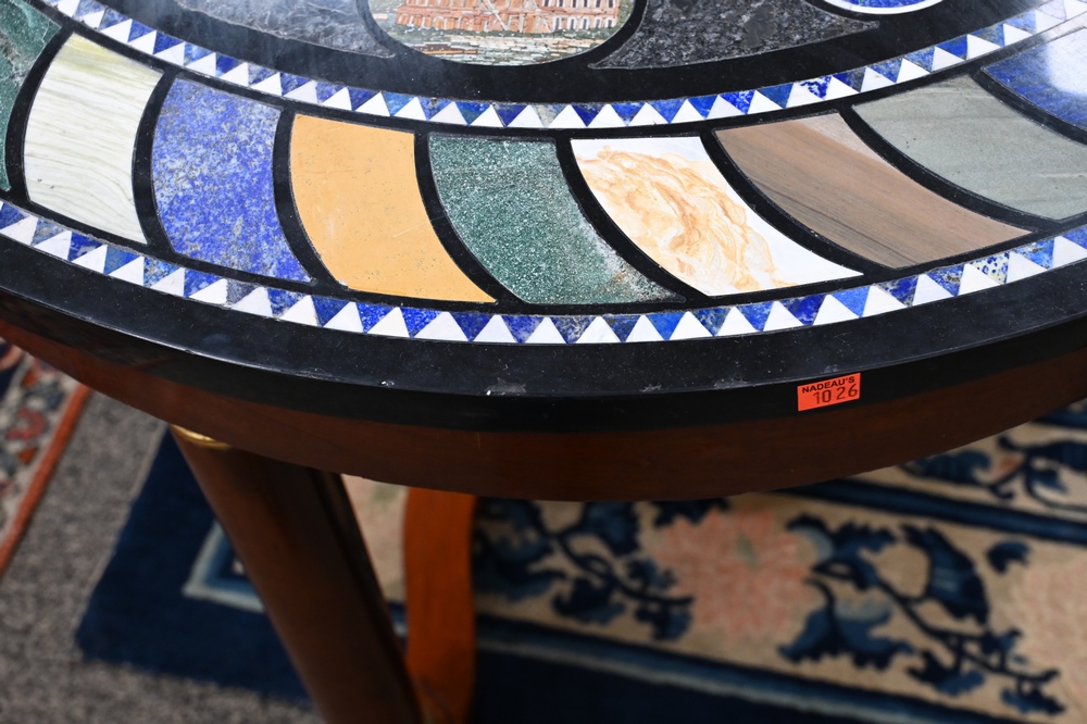 Lot 658: Empire Mahogany Round Center Table, having pietra dura and micro mosaic top of flowers, Colosseum and various buildings, height 29 i…