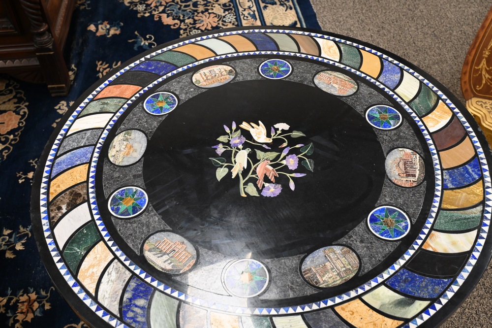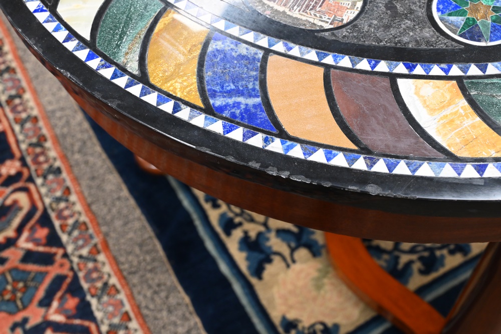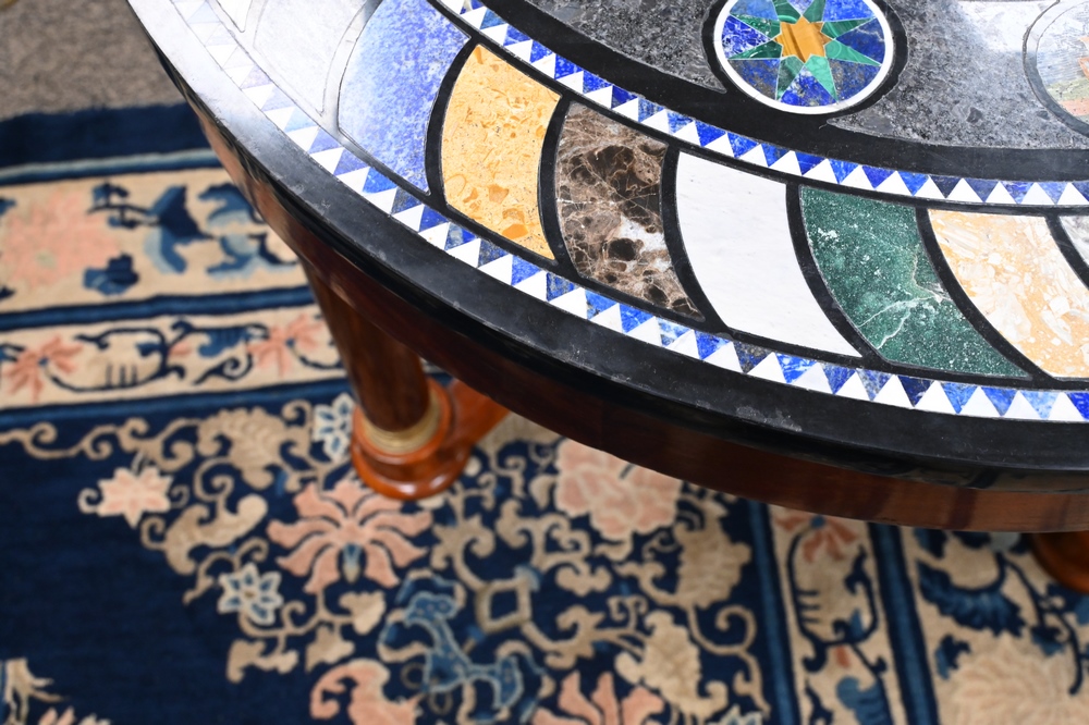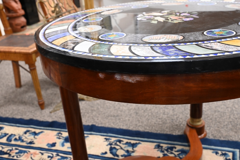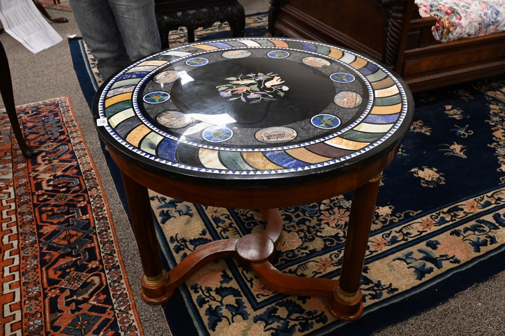 Lot 658: Empire Mahogany Round Center Table, having pietra dura and micro mosaic top of flowers, Colosseum and various buildings, height 29 i…