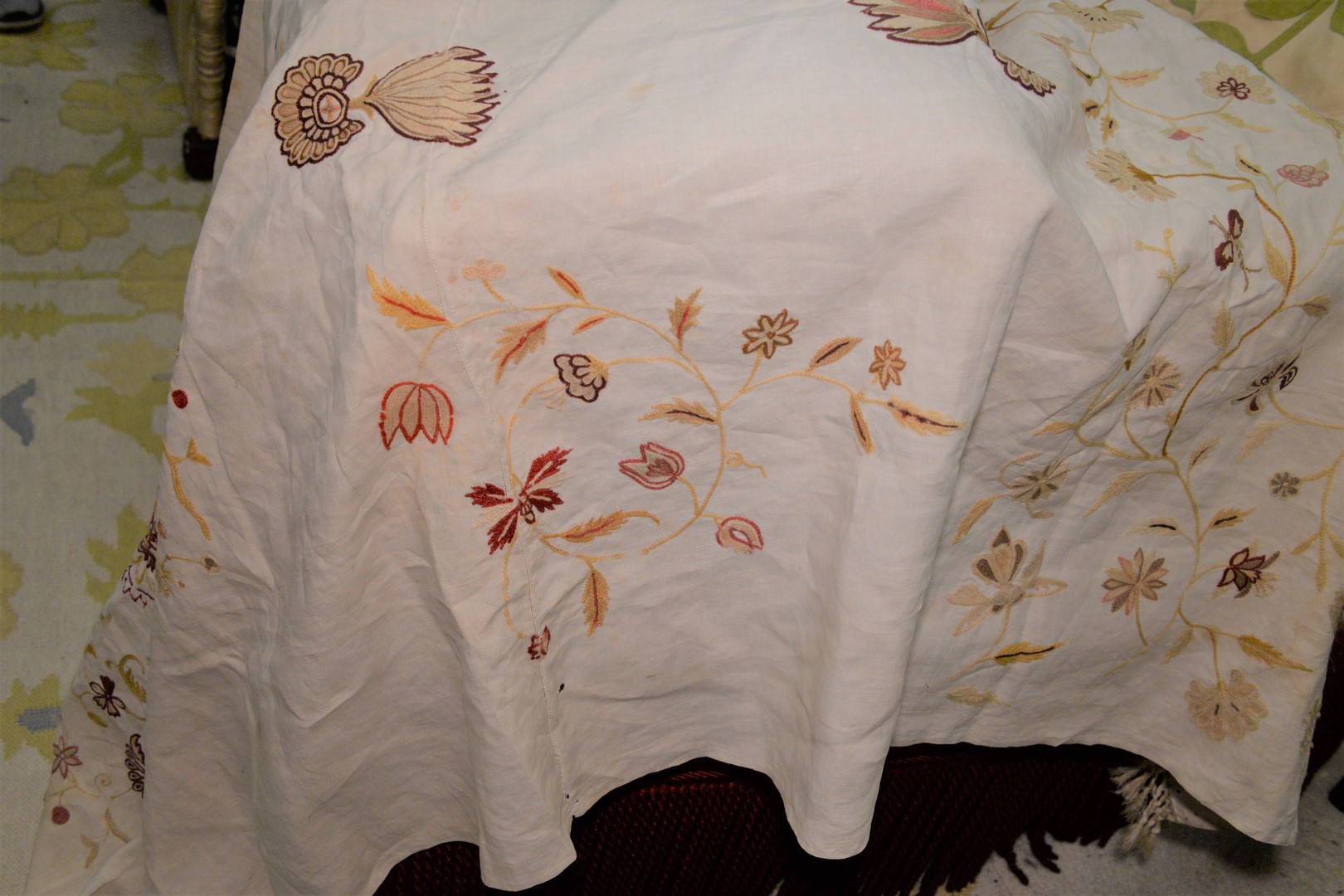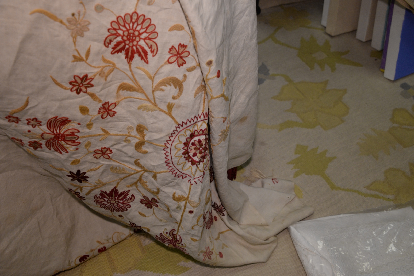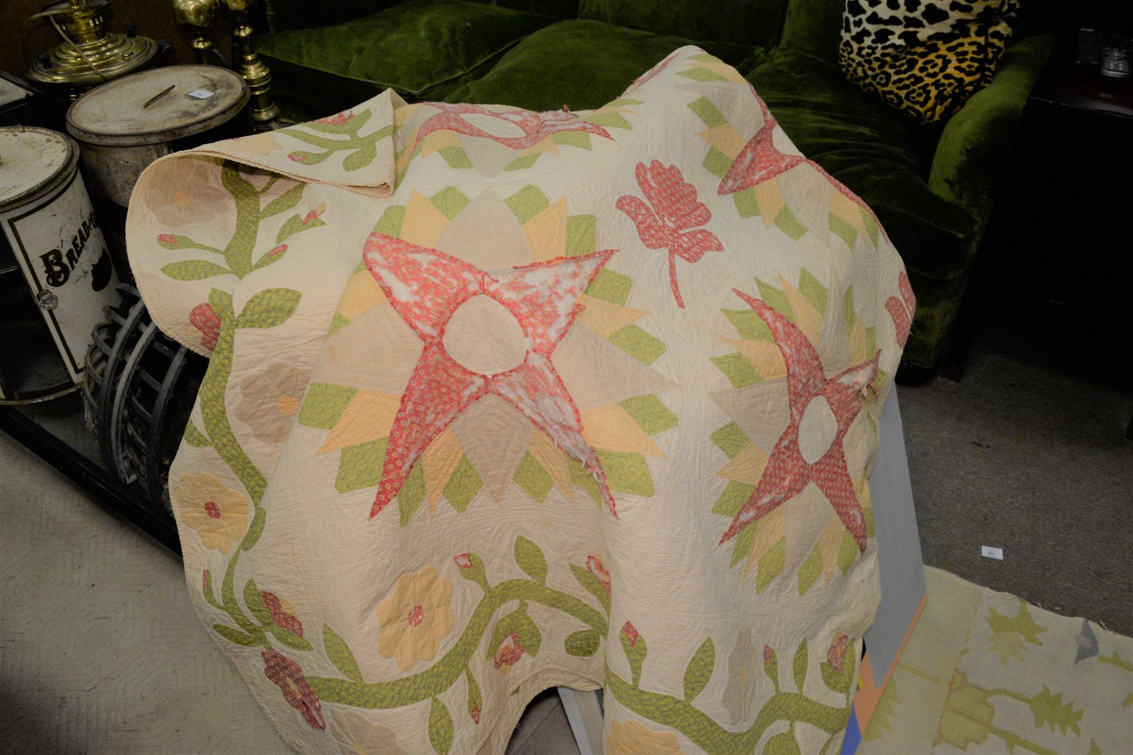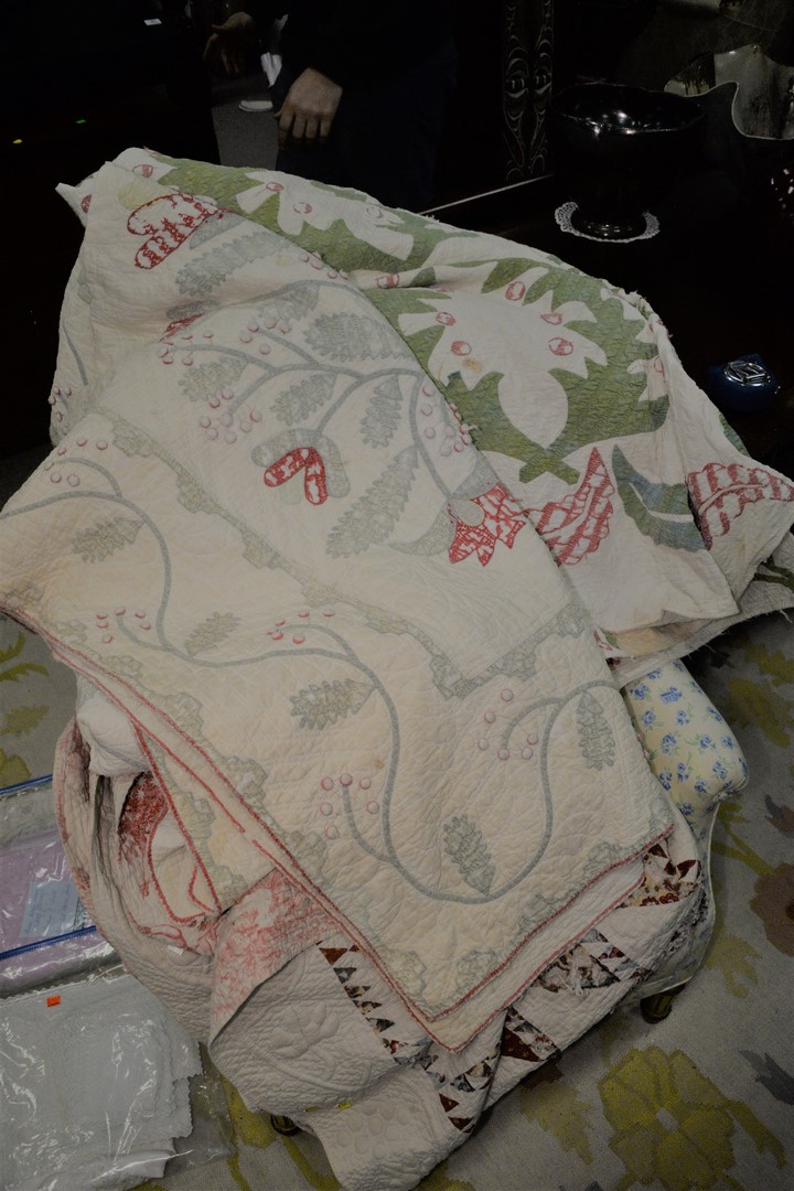 Lot 658: Group of Five Quilts, one embroidery on linen, plus four small oriental mats and doilies, all with wear Provenance: The Estate o…