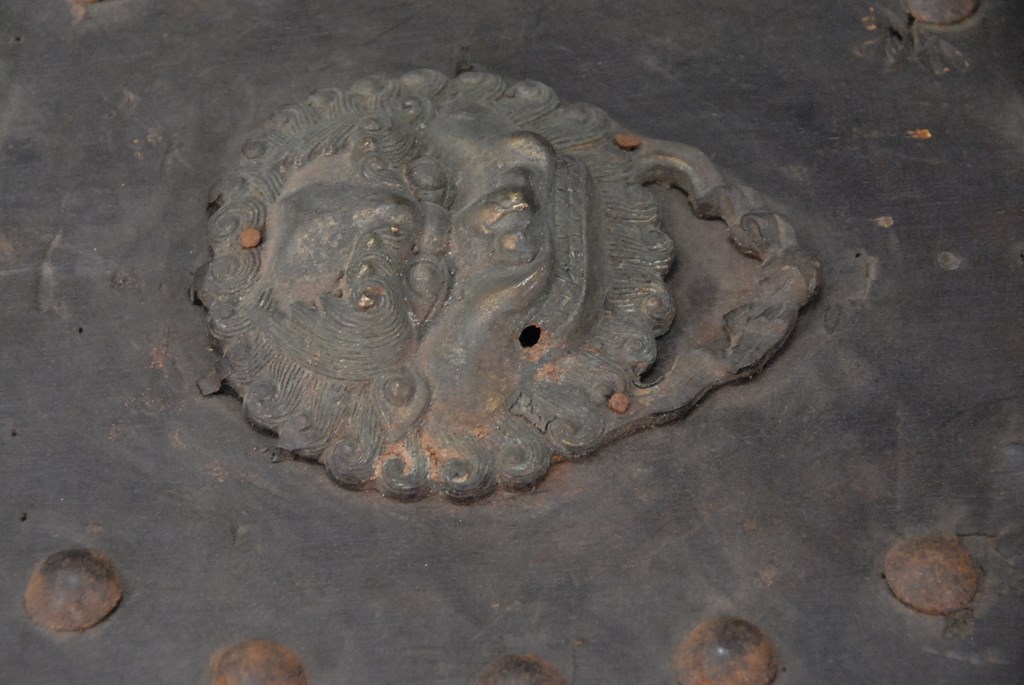 Japanese wood shield with metal mounts.