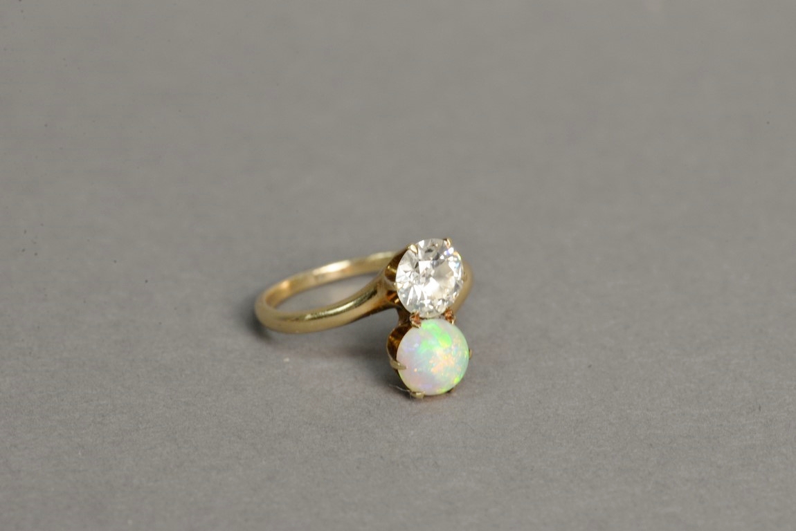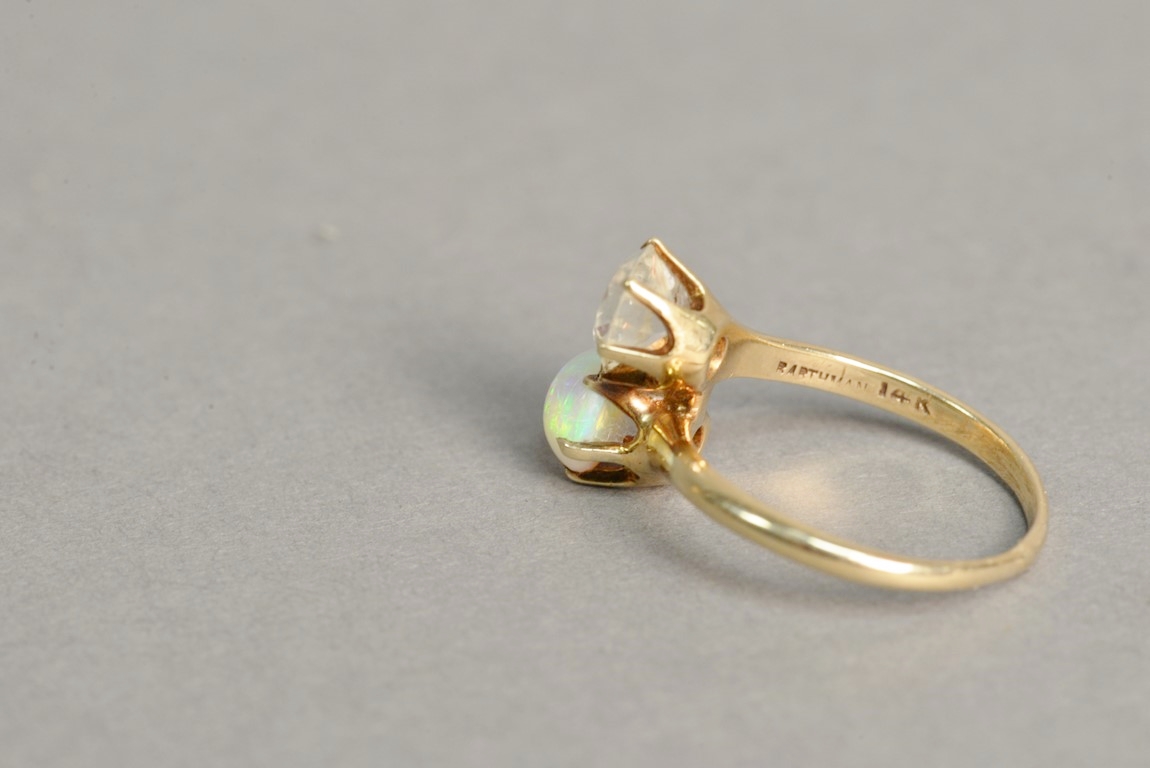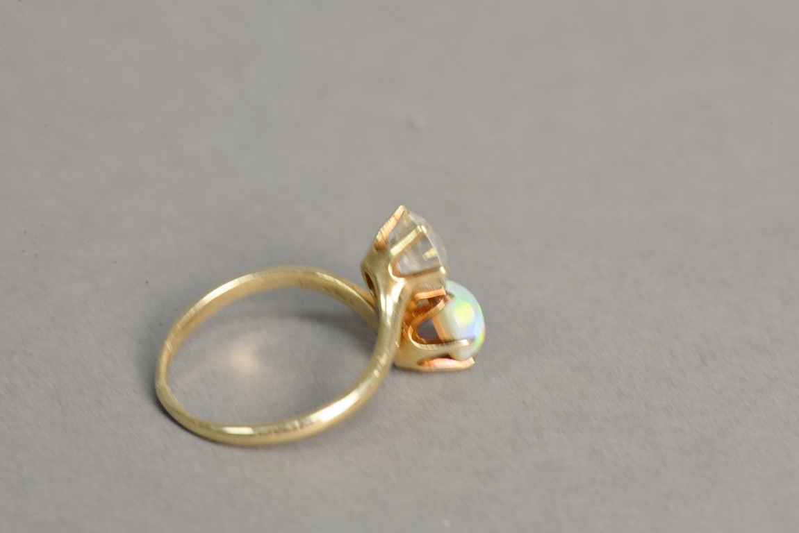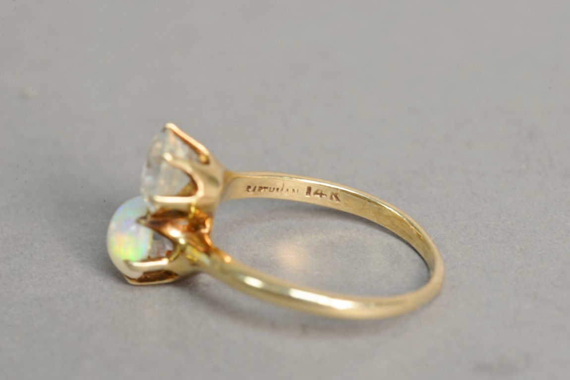 14K gold ring set with diamond and opal. diamond: approximately 1.3 cts.