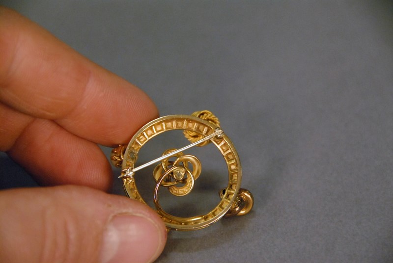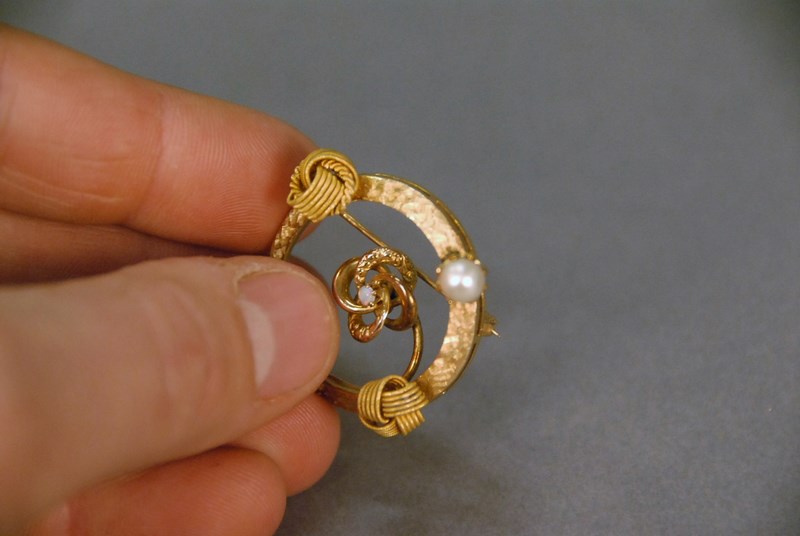 14K gold Victorian circular pin set with pearl and one small opal. 10.2 grams dia. 1 1/4in.
