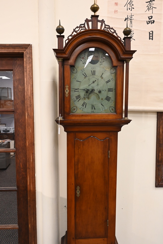 Lot 66: Asahel Cheney Tall Clock having fretwork top over tombstone door, over shaped top door, on base with bracket feet, painted metal dial is marked Asahel Cheney with brass works height 90 inches Provenance: Fifty Year Personal Collection of Clocks and American Antiques from Thomas Bailey, Manchester, Connecticut.