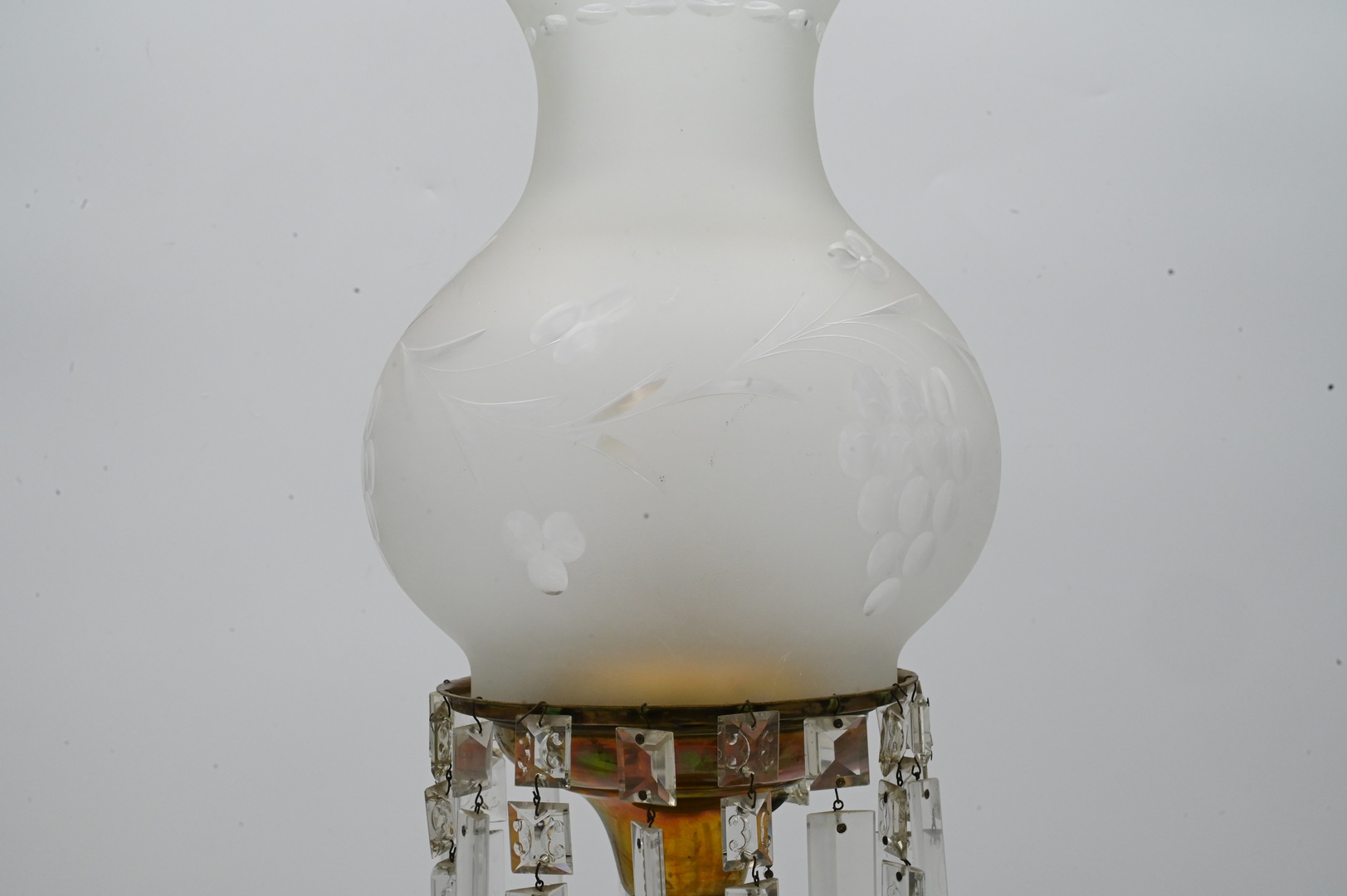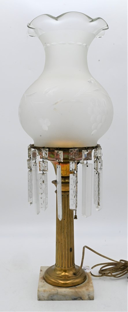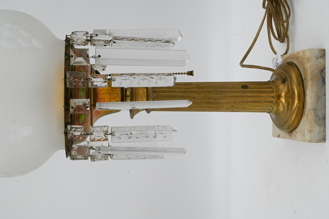 Astro Lamp, having etched shade and prisms, on brass column, on marble base, electrified, height 12 inches. Provenance: An estate from Redding, CT.