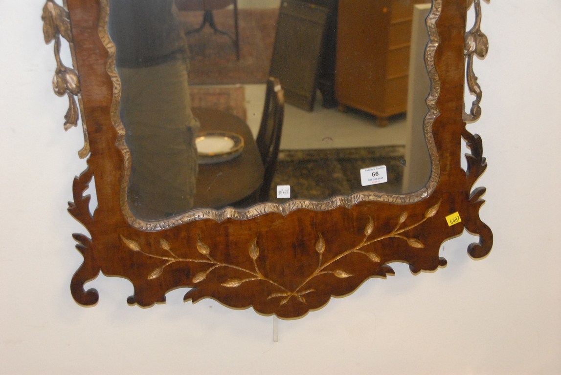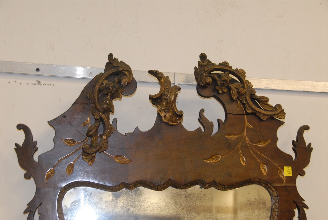 Lot 66: Chippendale mahogany mirror with pediment top and old glass flanked by gilt fruit, 18th century. ht. 48in. wd. 35in. Provenance: Es…