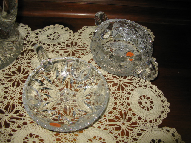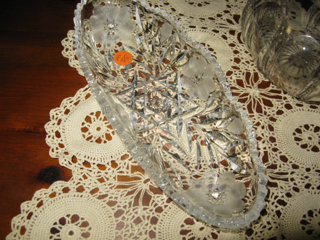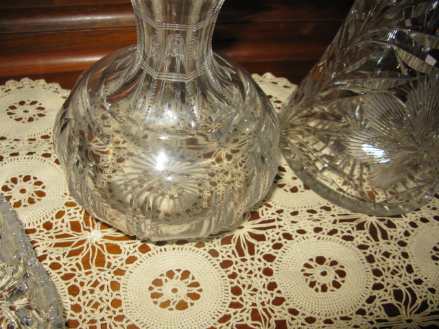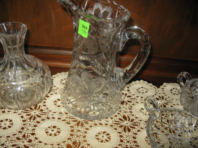 Five piece lot of cut glass, including a water pitcher, a small dish, celery dish, sugar bowl and carafe, each with butterflies and flowers.