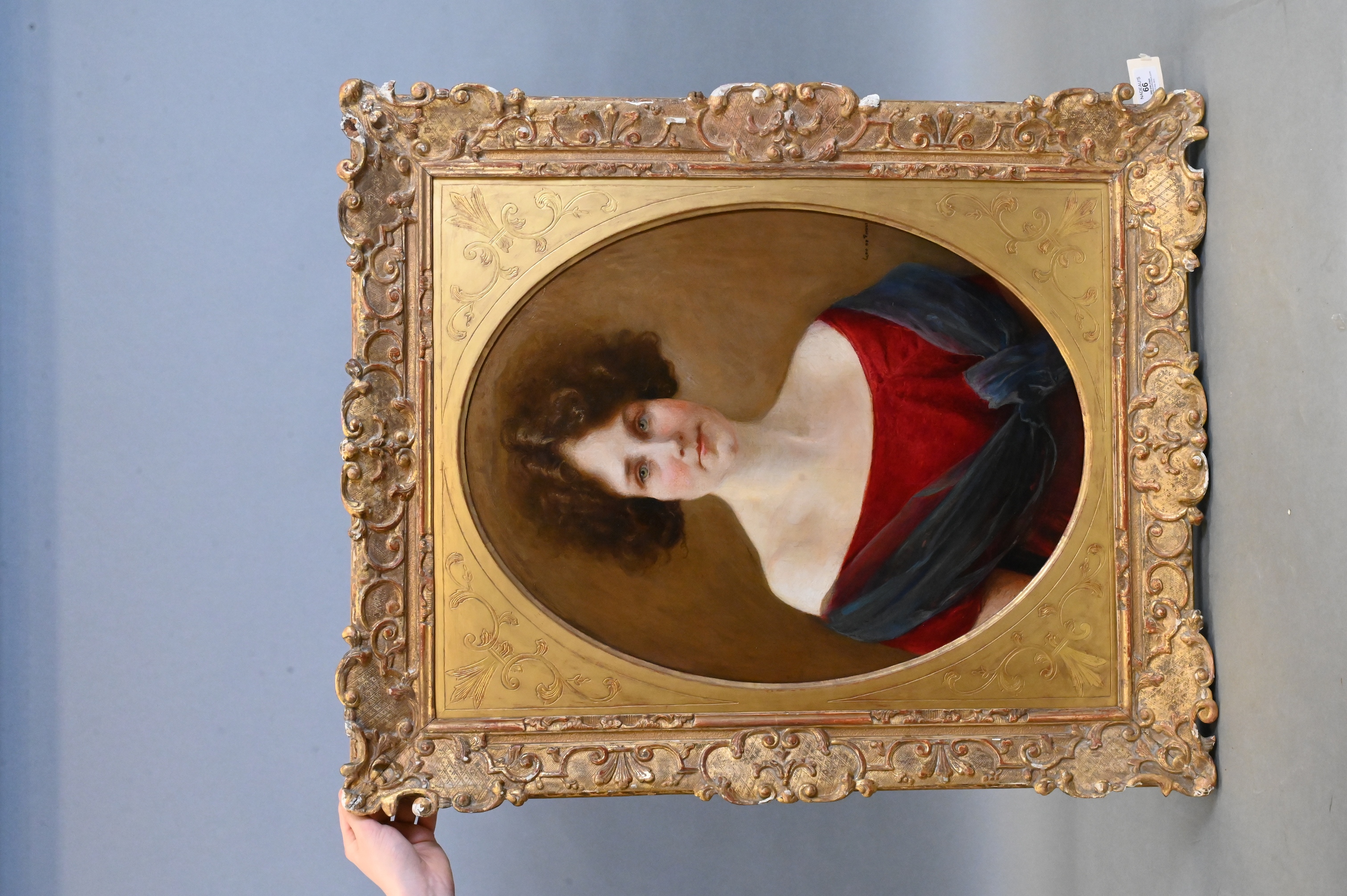 Portrait of a woman with green eyes and brown hair, in a red dress and shawl