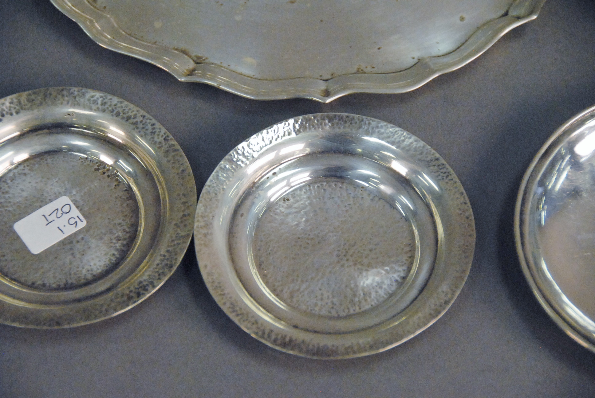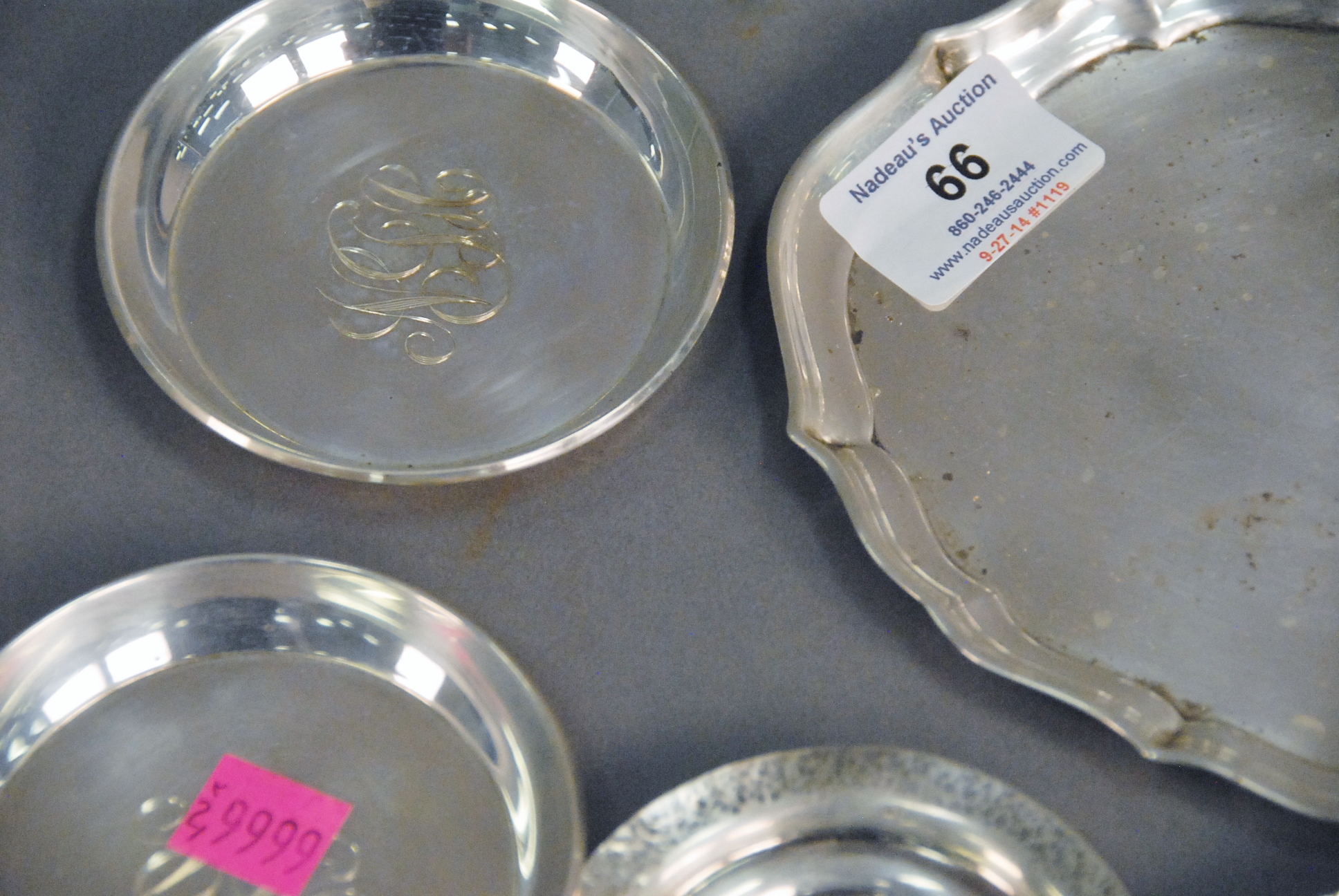 Lot 66: Group of sterling to include a small tray, Cartier saucer, Oriental coin in a dish, and four small dishes.15.18 t oz.
