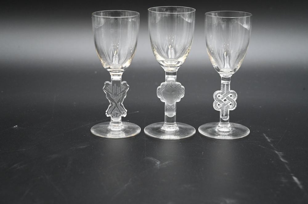 Group of Ten Lalique Cordials, with figural stems, height 4.5 inches.