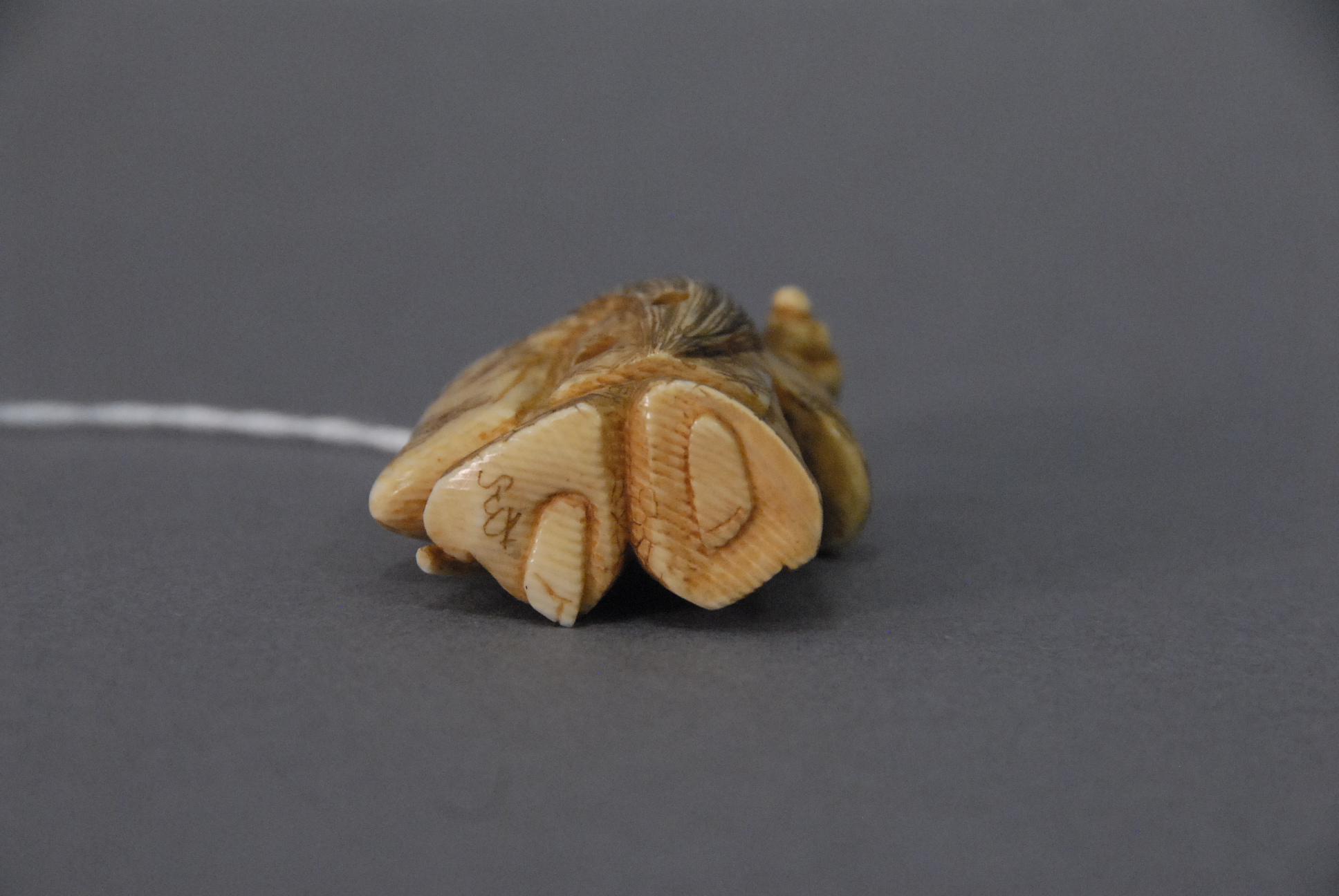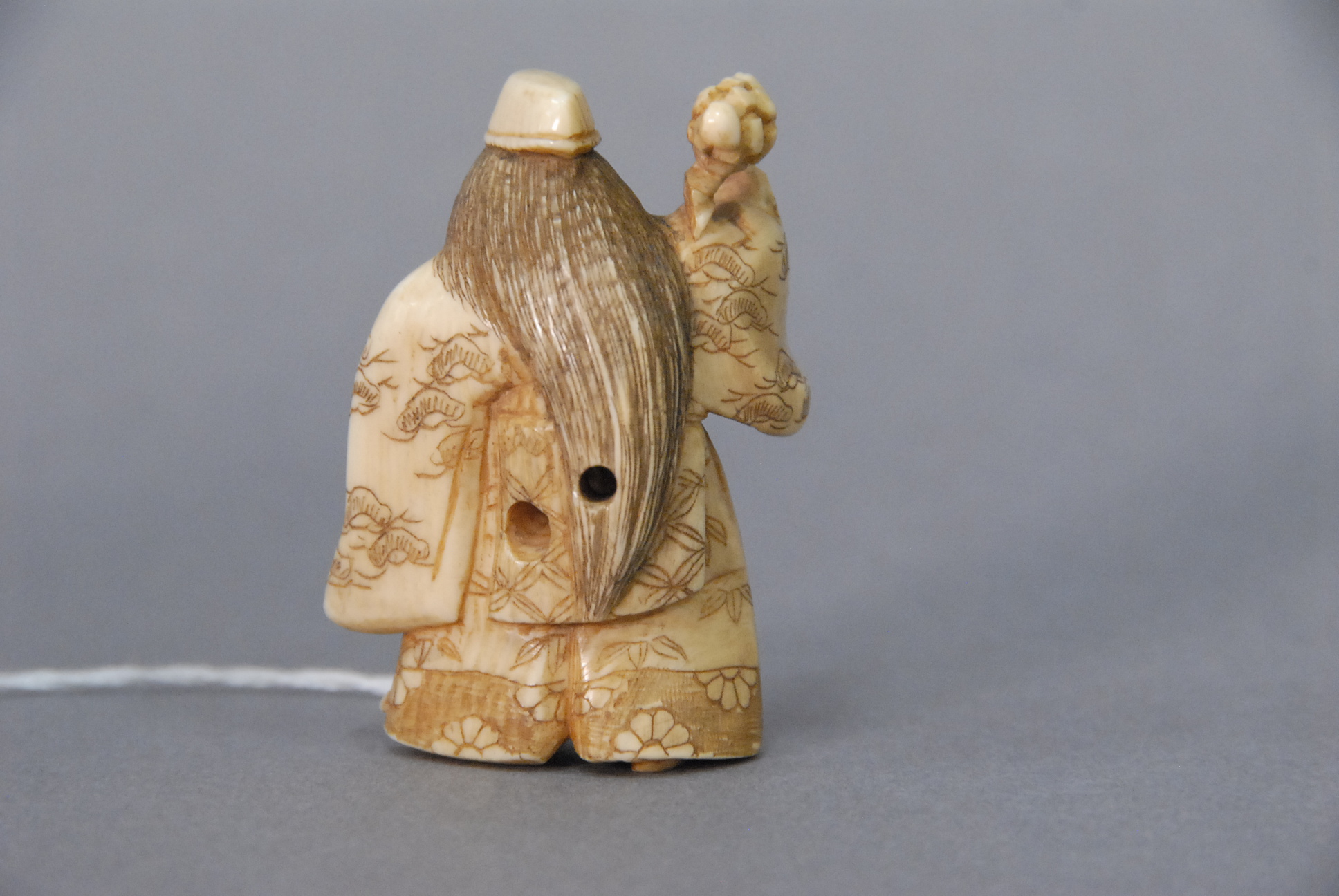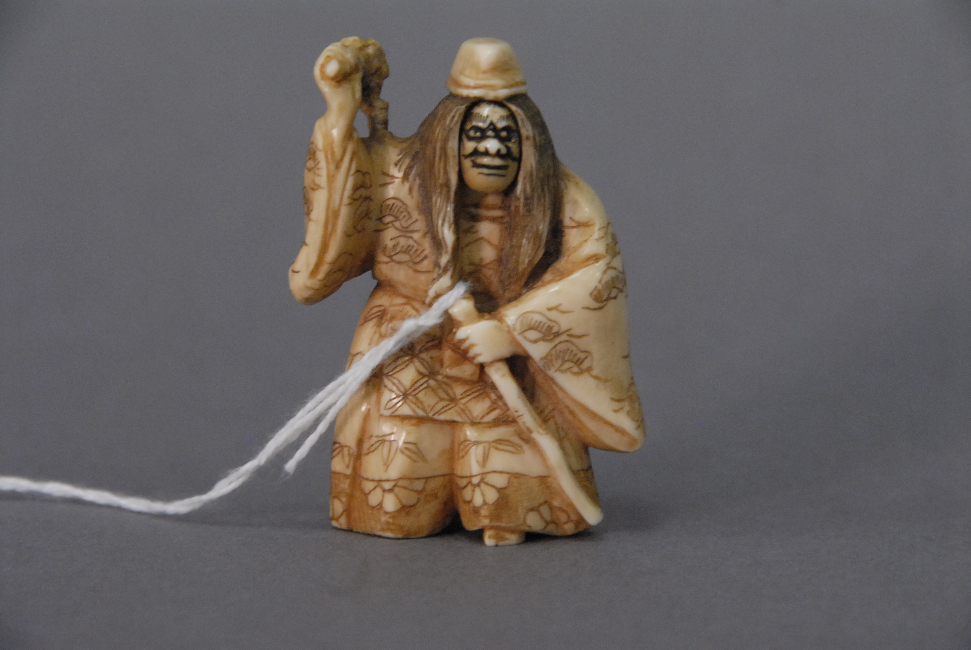 Ivory netsuke carved of man holding a weapon with a revolving face, ht. 2.