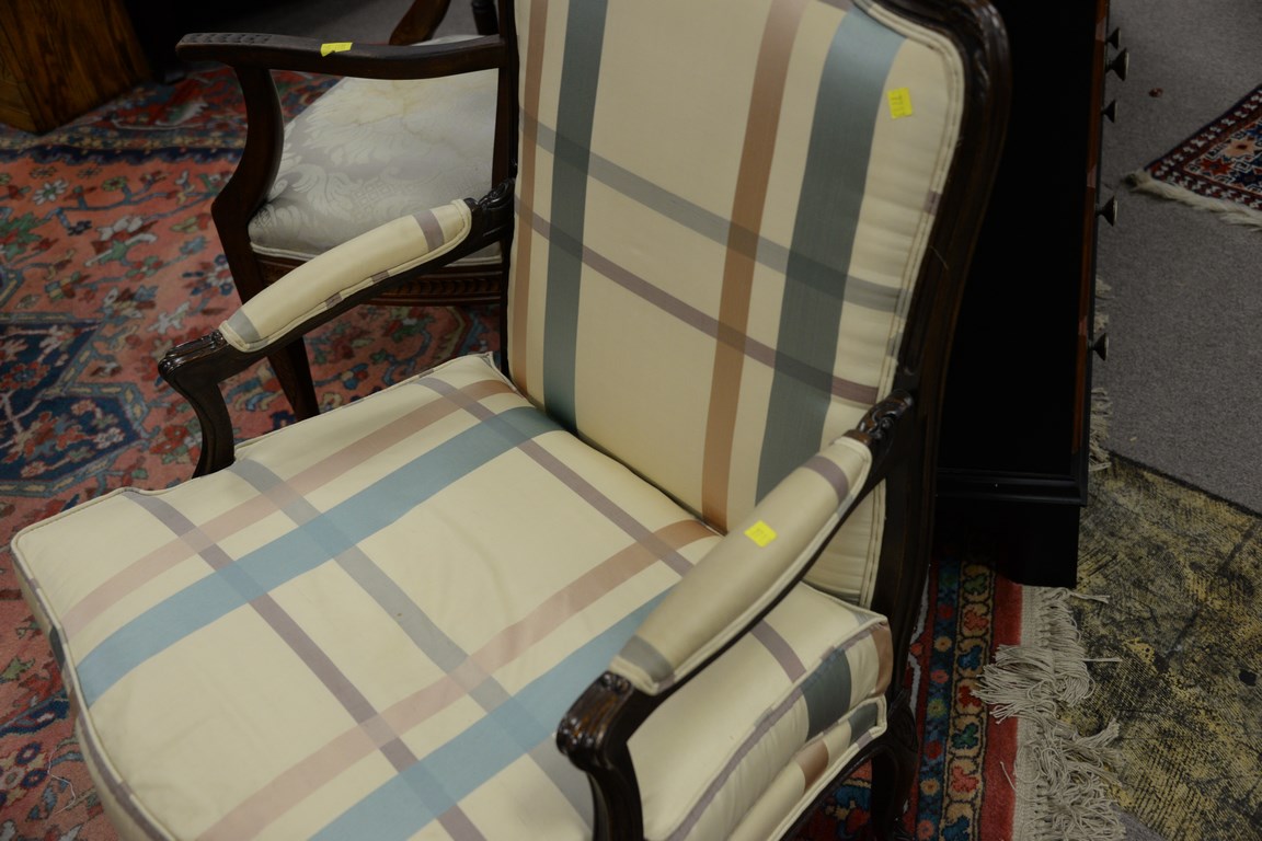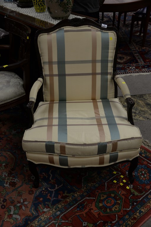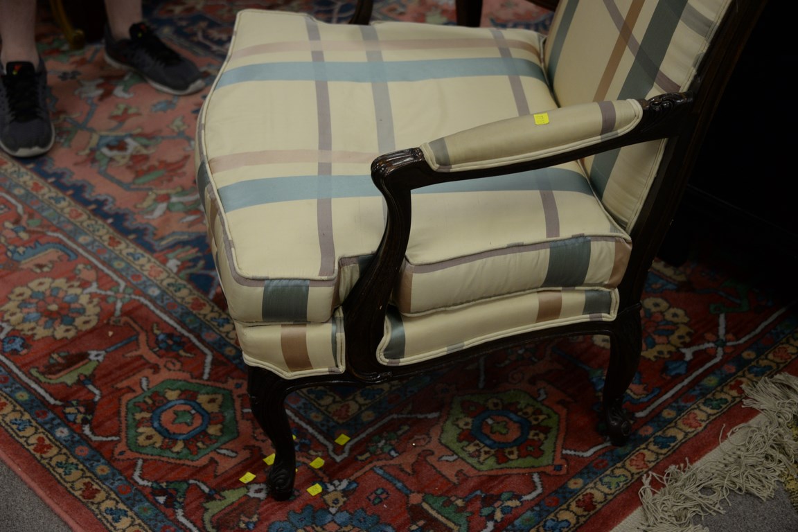 Louis XV style chair with silk custom upholstery and mahogany teacart.