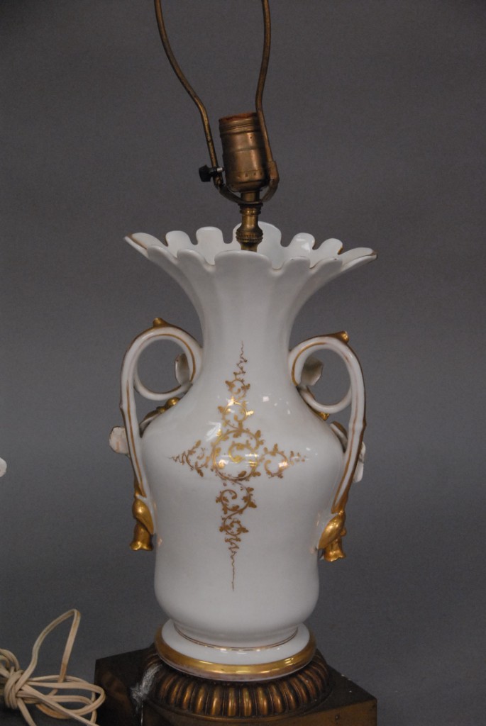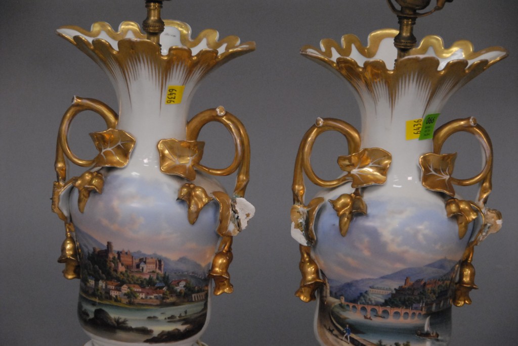 Lot 66: Pair of French porcelain vases made into table lamps with hand painted scenes, each with repairs to leaves, 19th century.
