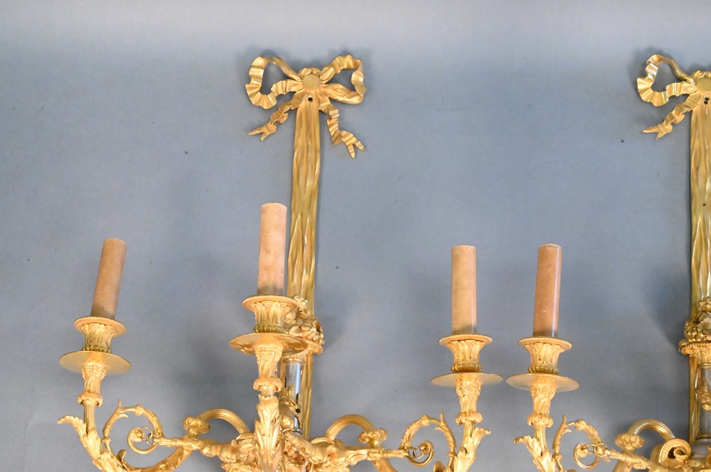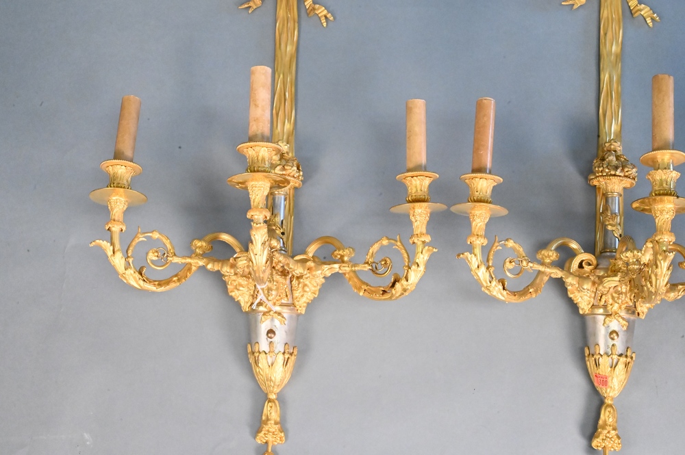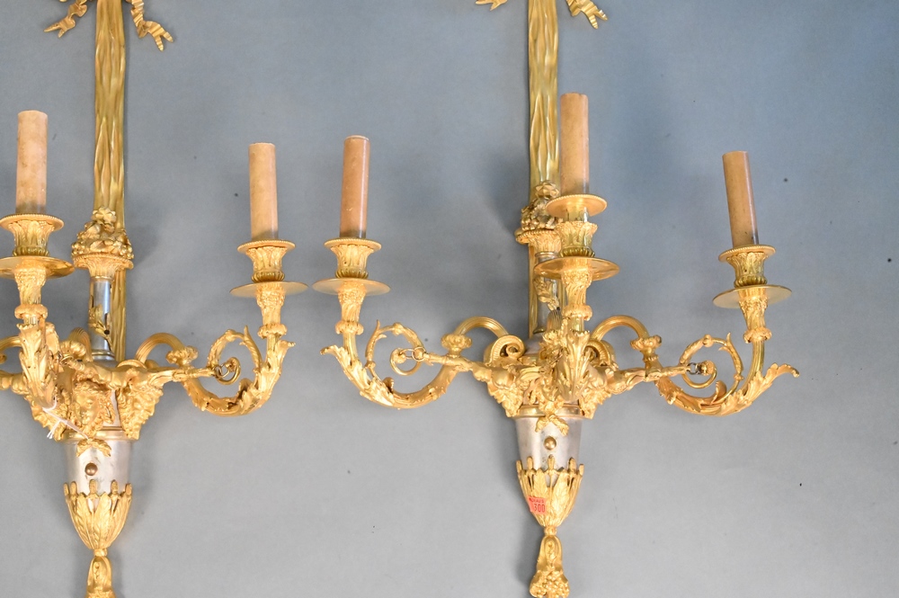 Pair of Gilt Bronze Sconces,having white brass bodies and heads with ram horns and female faces, electrified, height 30 inches.