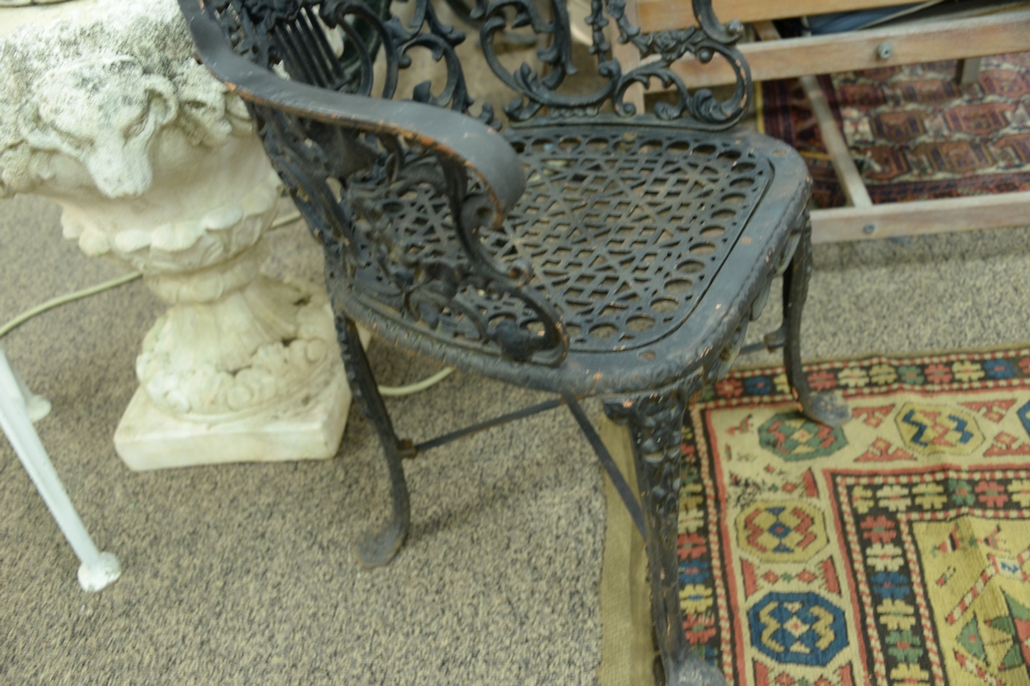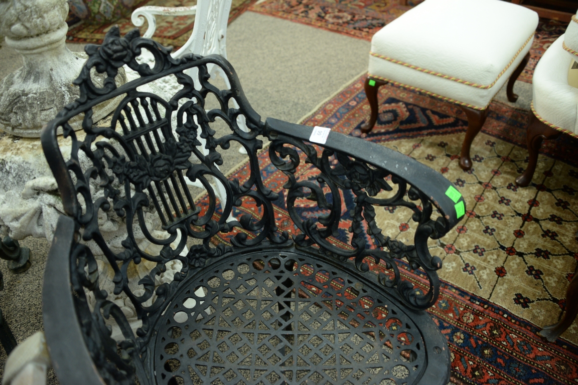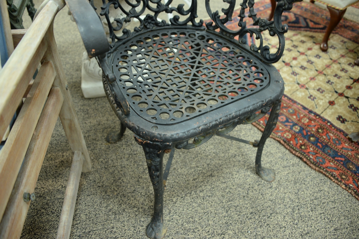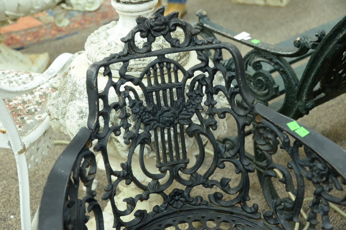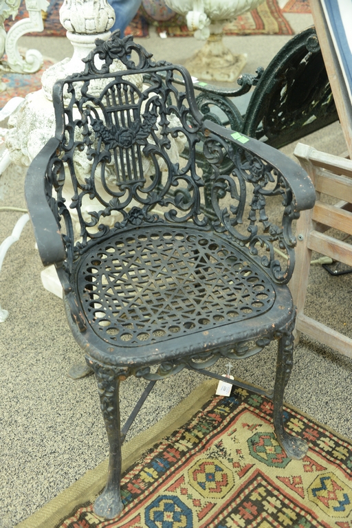 Pair of Victorian iron armchairs with floral and harp backs. ht. 32in., wd. 21in.