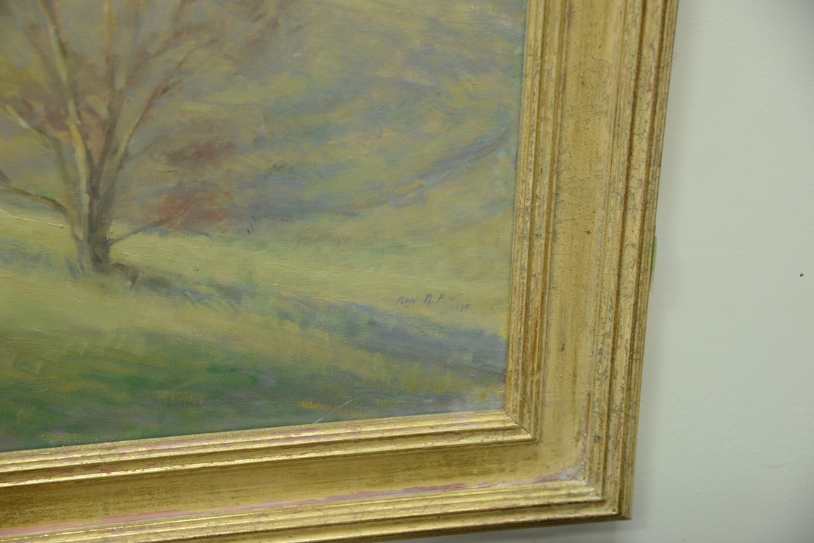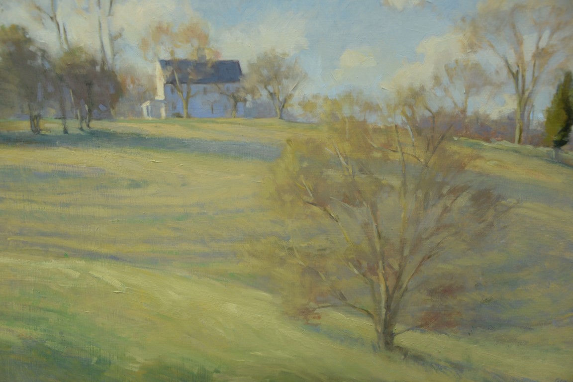 Peggy N. Root 1987 oil on masonite Lyme House on a hill/sunny fall day, Lyme Academy Gallery label on back exhibition 1987 17 3/4 x 23 1/2