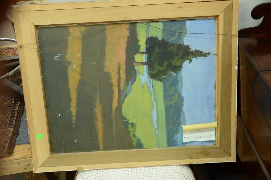 Lot 66: Peggy N. Root 1987 oil on masonite Lyme House on a hill/sunny fall day, Lyme Academy Gallery label on back exhibition 1987 17 3/…