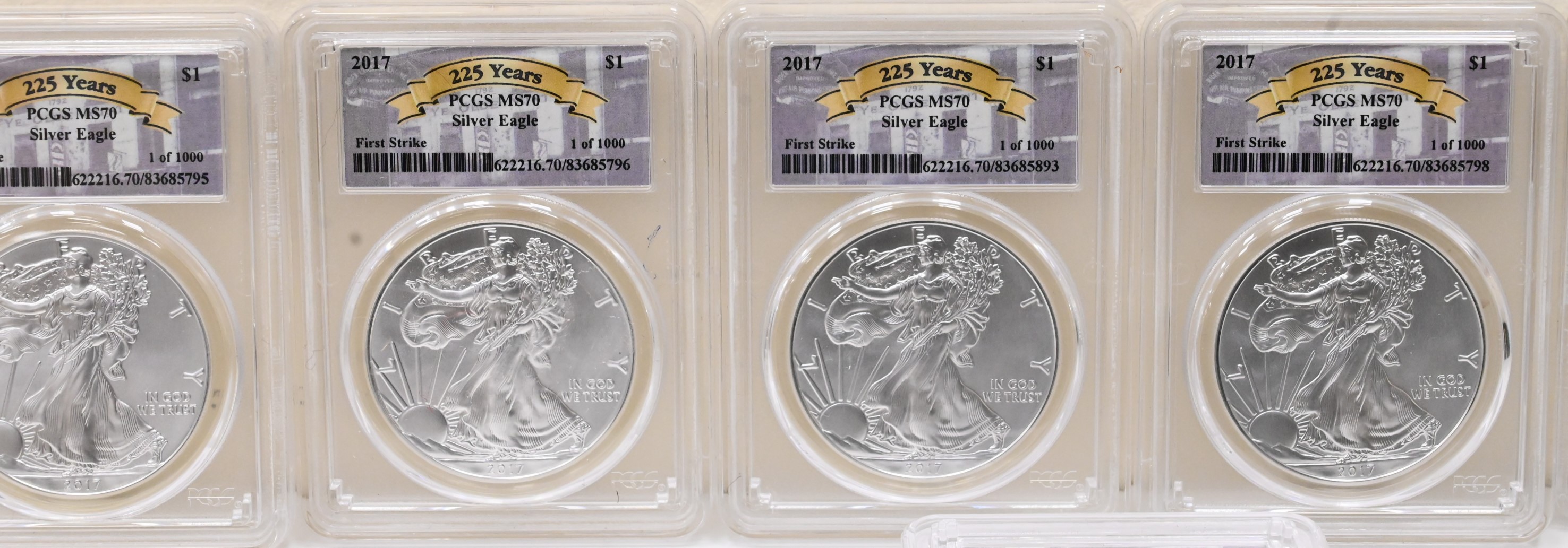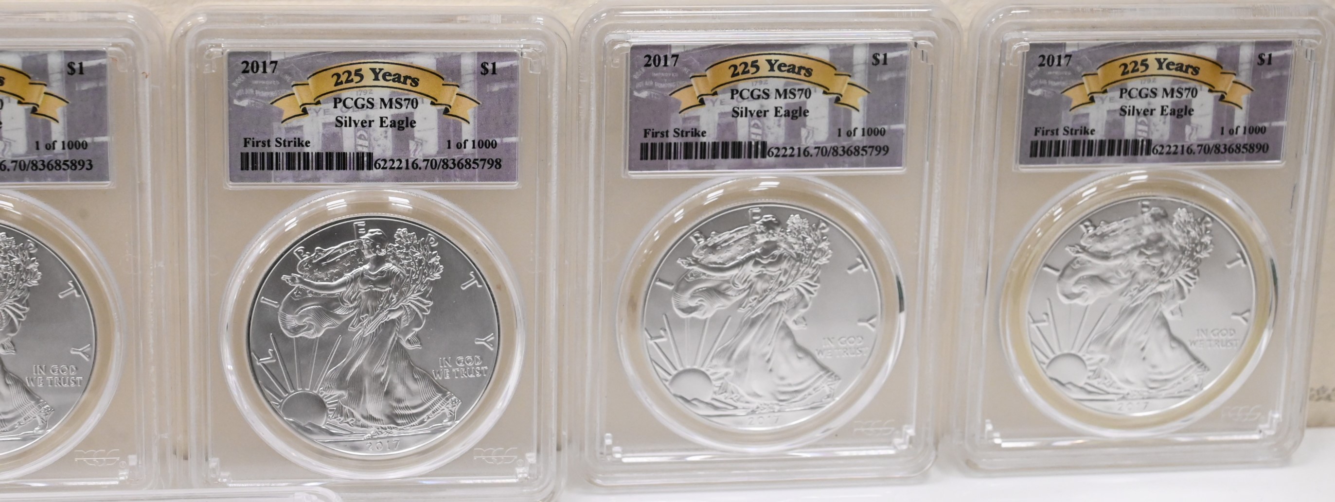 Seven Piece Coin Lot, to include seven 2017 PCGS MS 70 first strike American Silver Eagles.