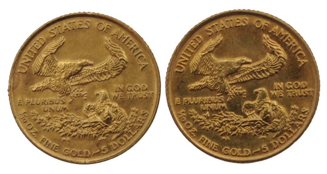 Two Eagle $5 Gold, 1990 and 1996, 1/10 ounce each.