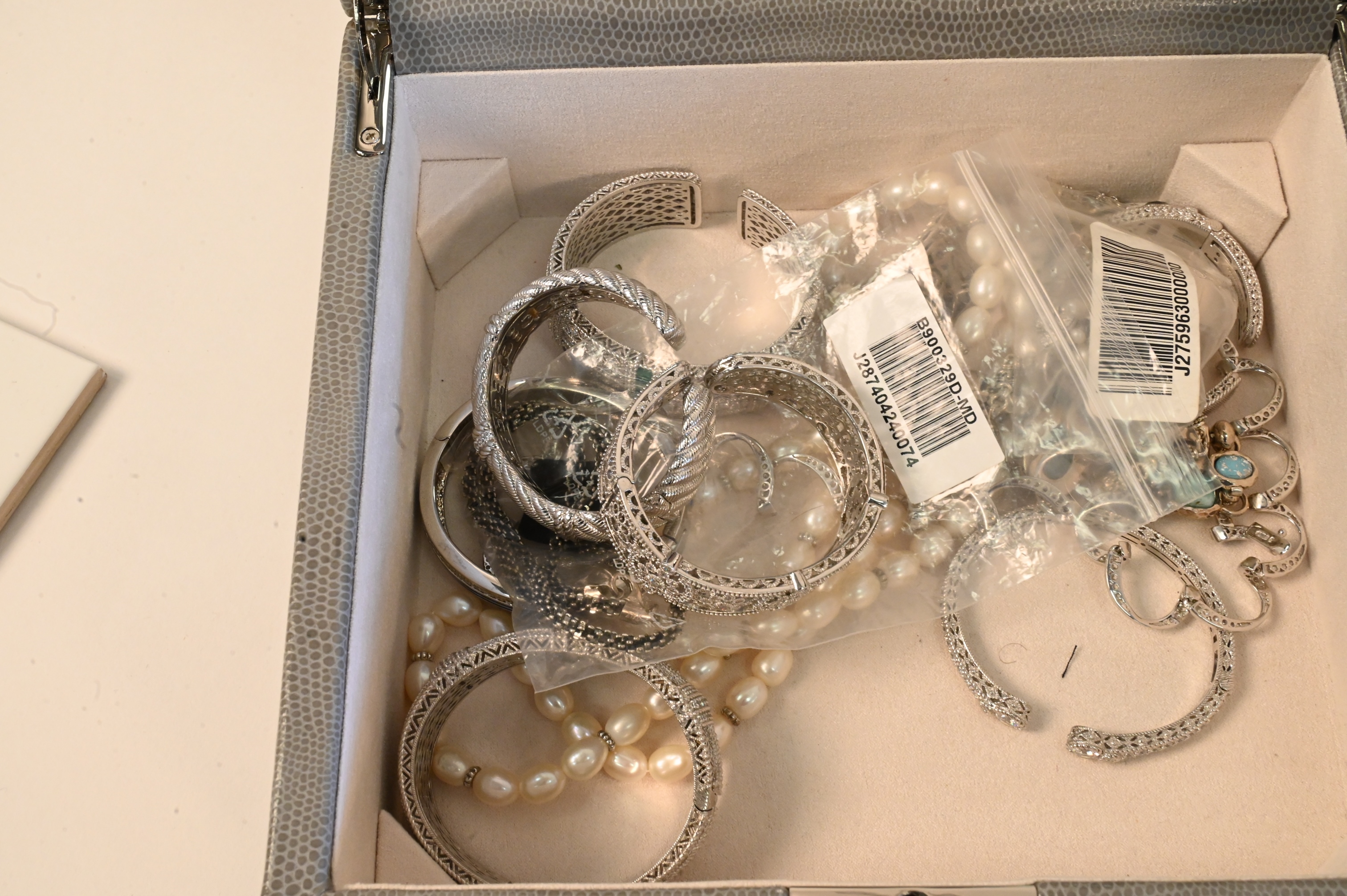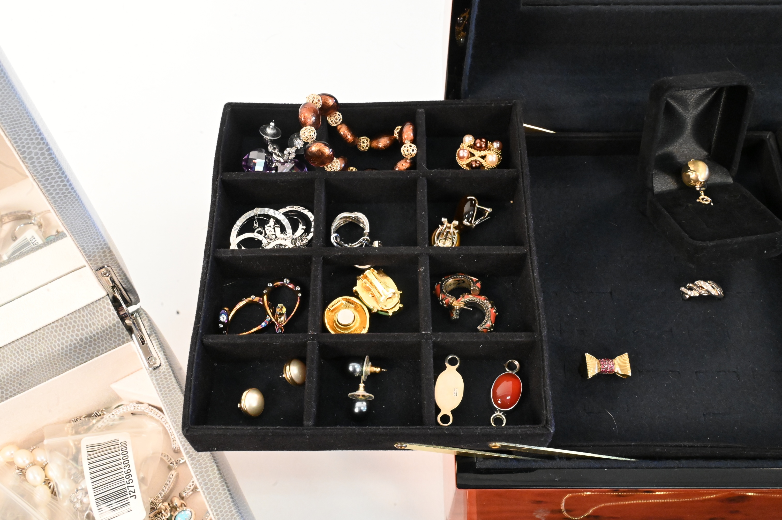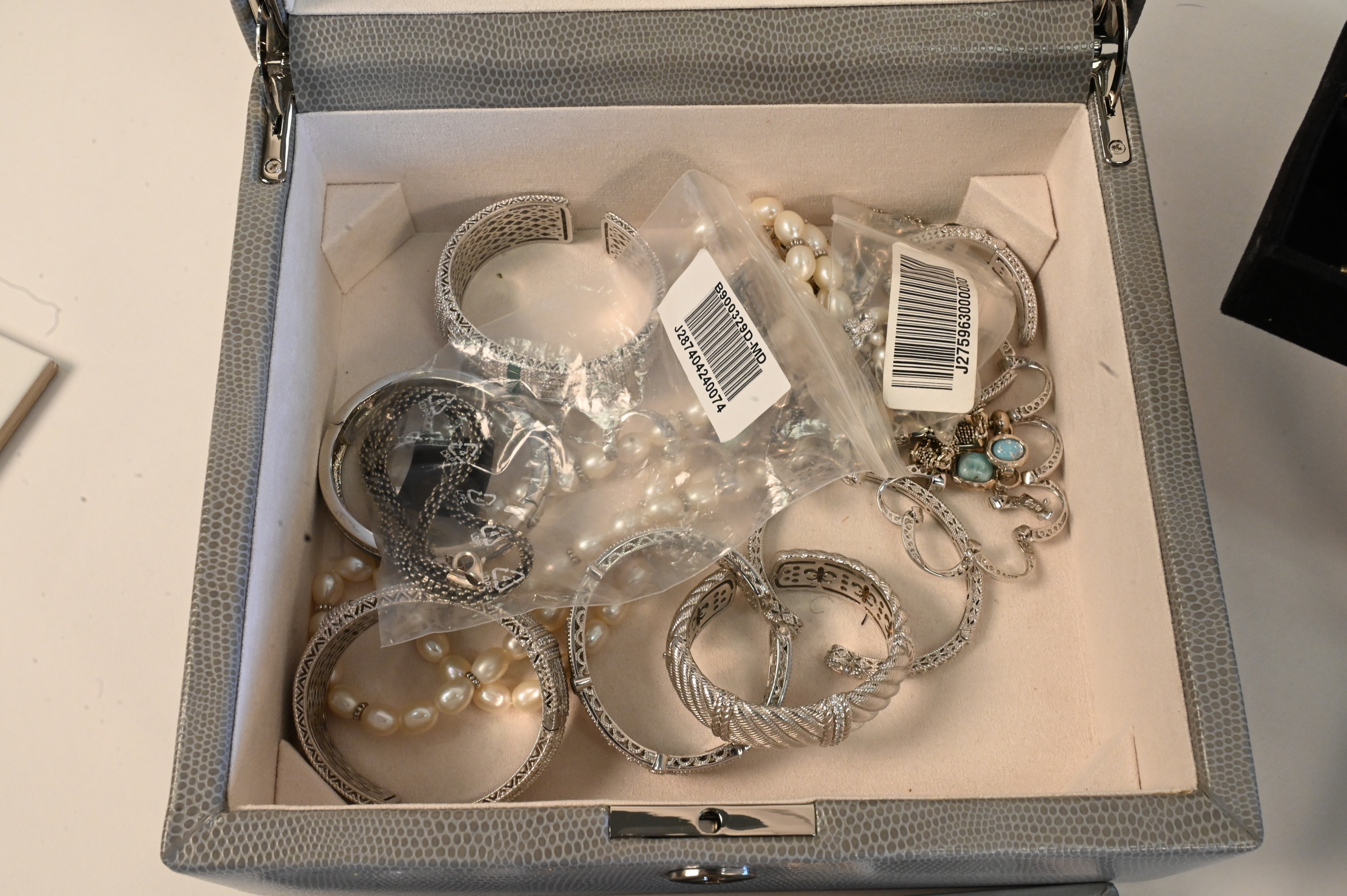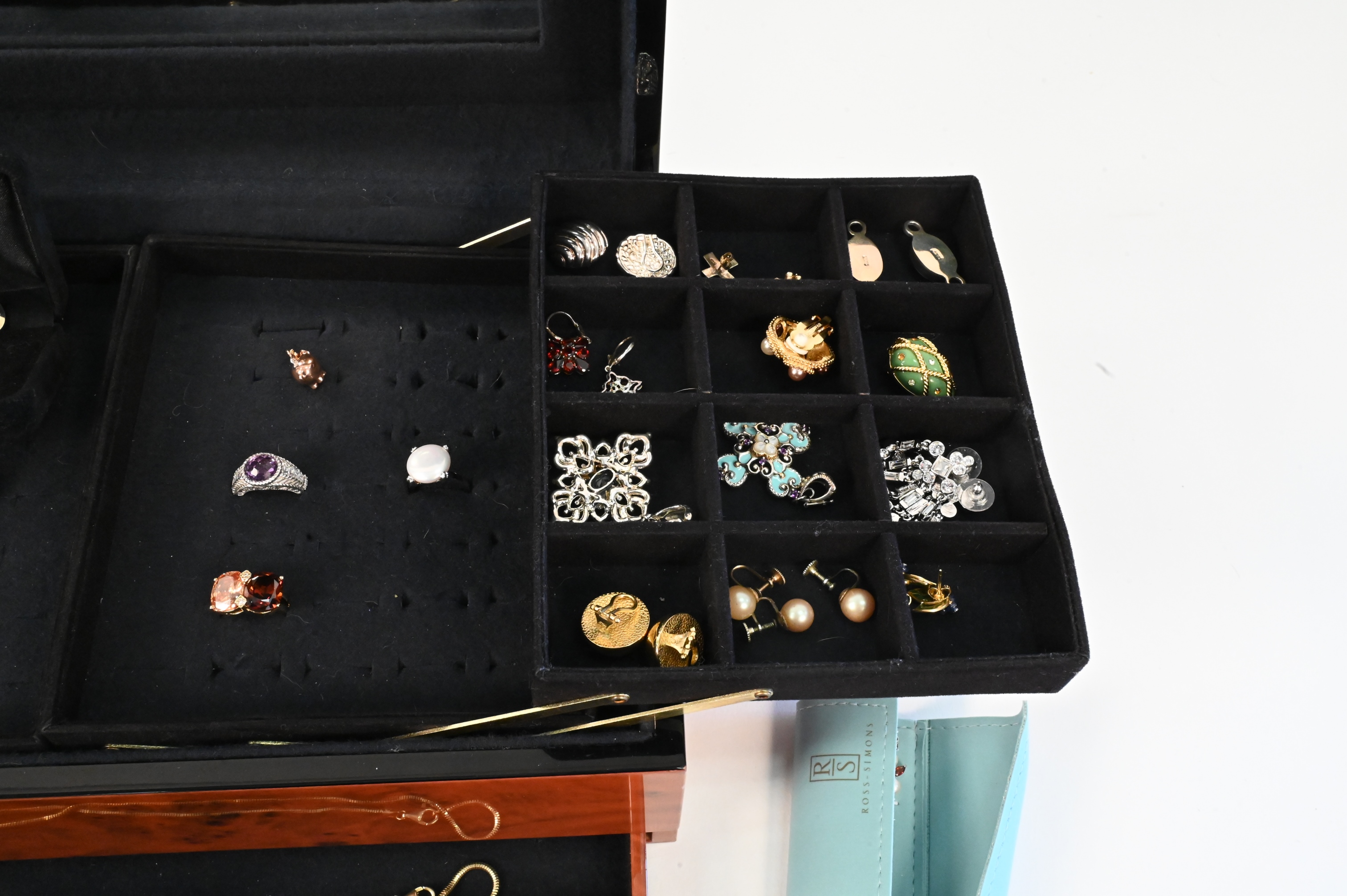 Two Jewelry Boxes of Mostly Silver Jewelry, to include earrings, bracelets, along brooches.