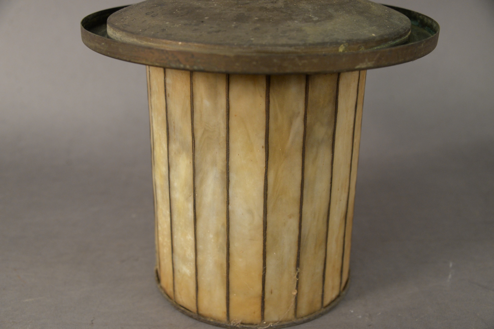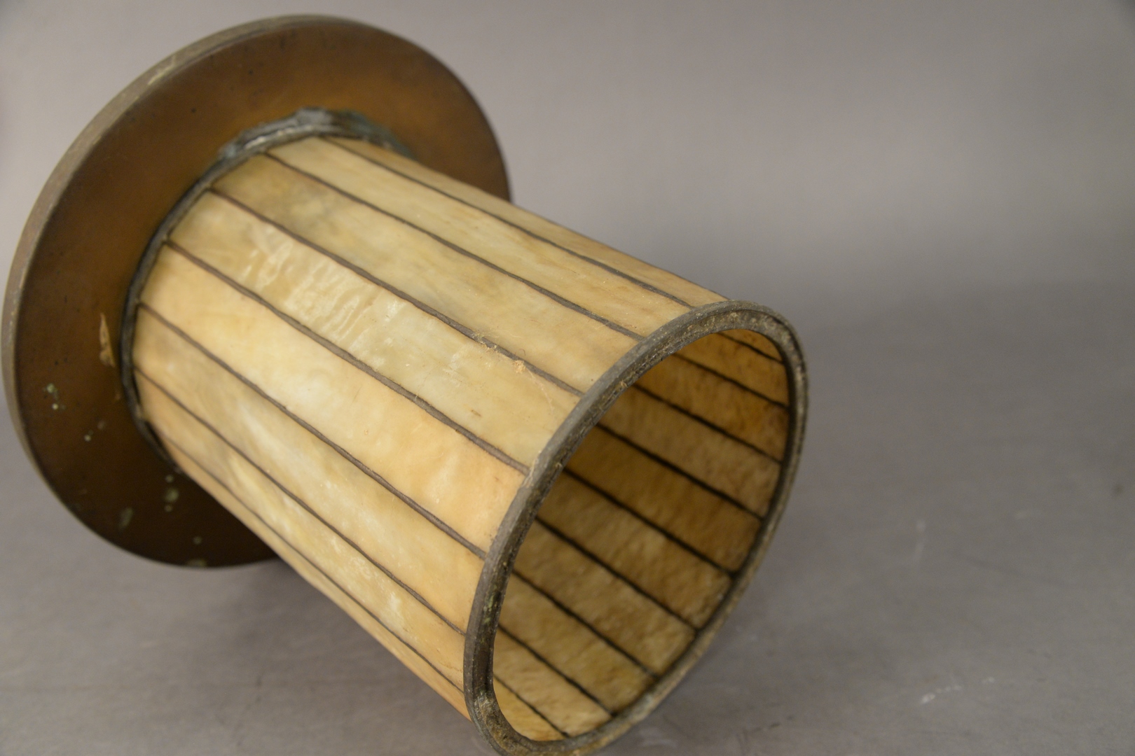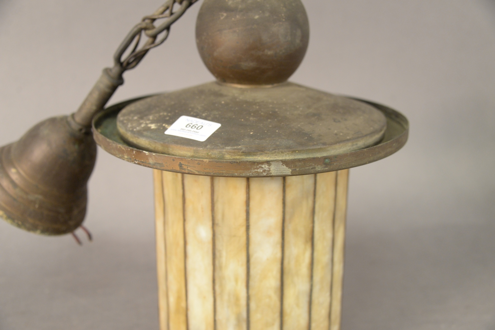 Arts and Crafts Leaded Glass and Copper Hanging Lantern, height 32 inches, width 12 inches.