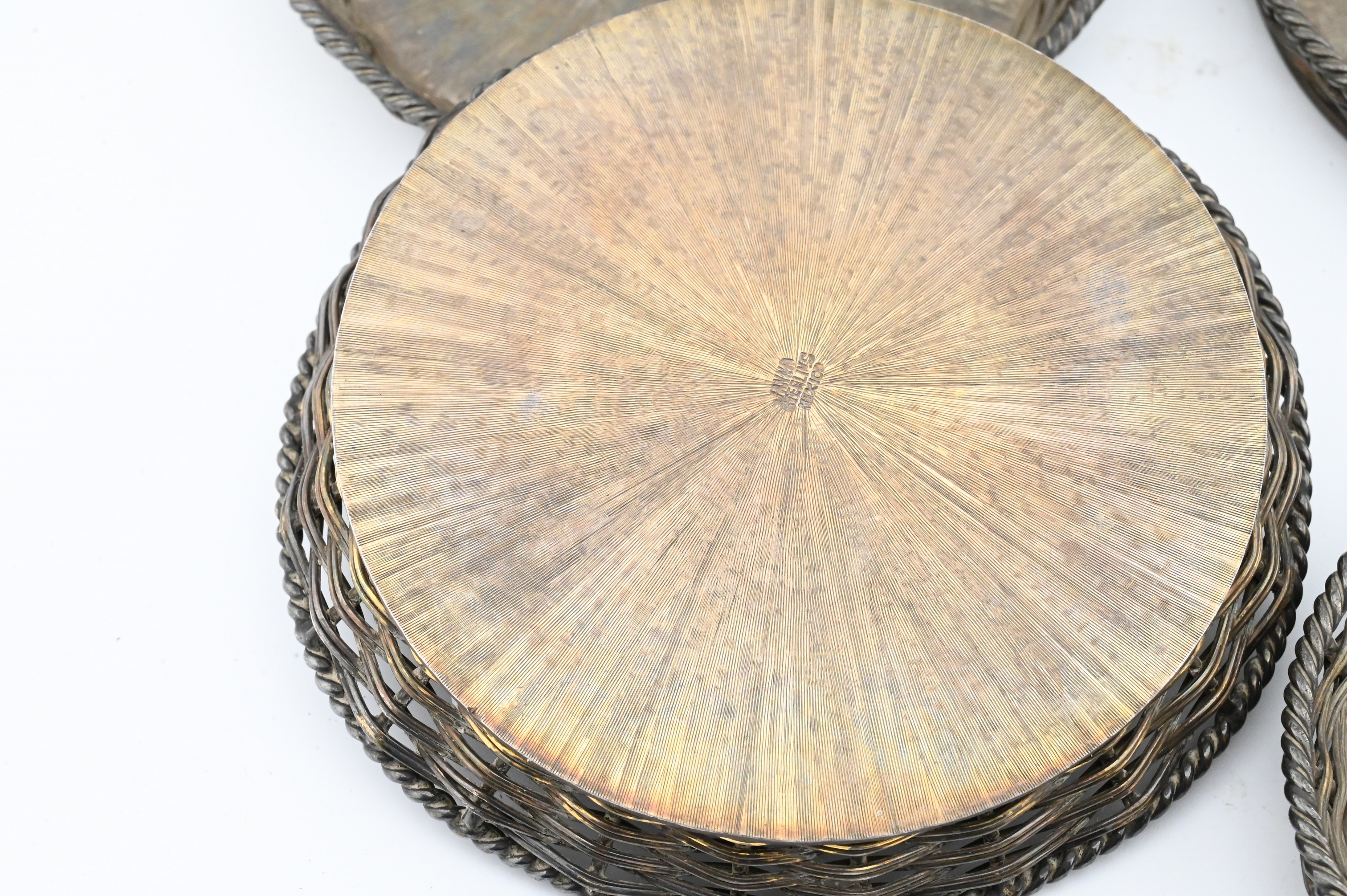 each circular with woven basket-style sides and radiating textured base, marked Mexico / Sterling / Janna