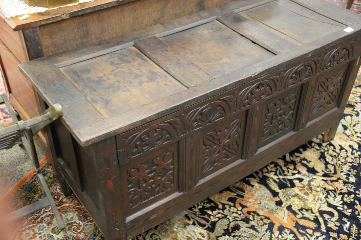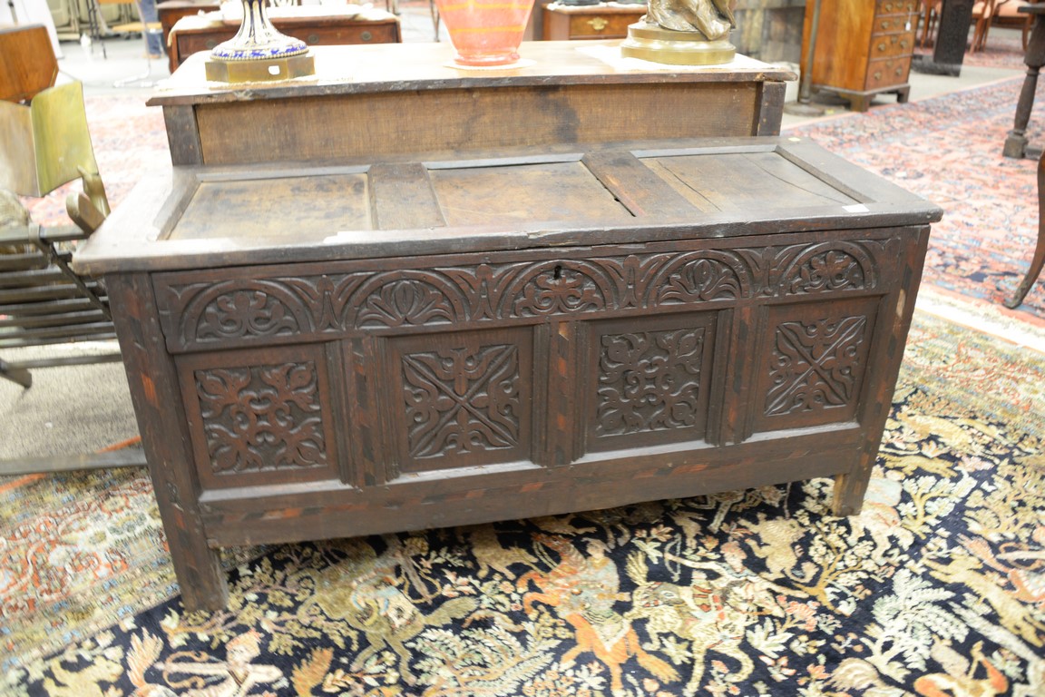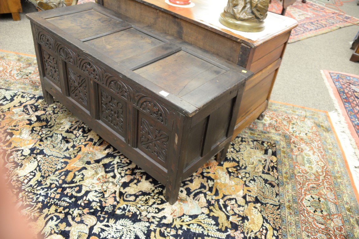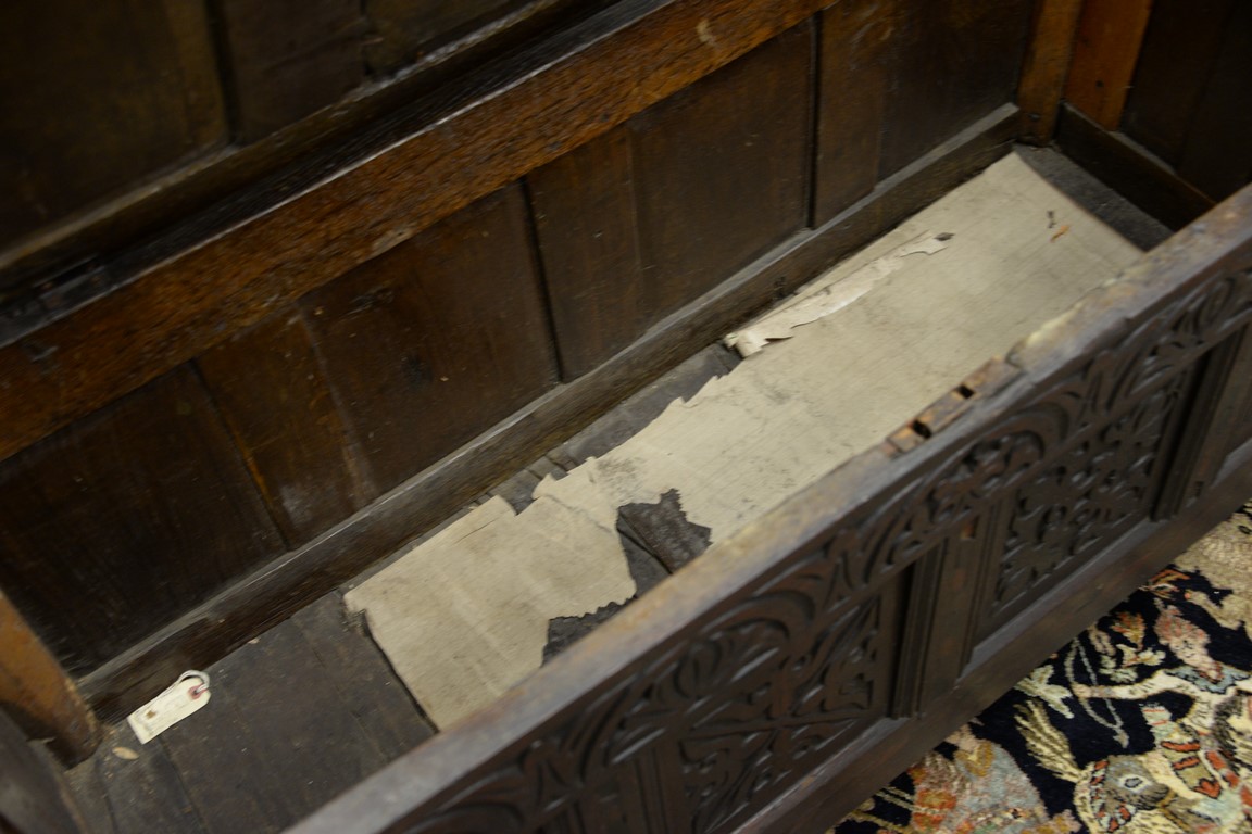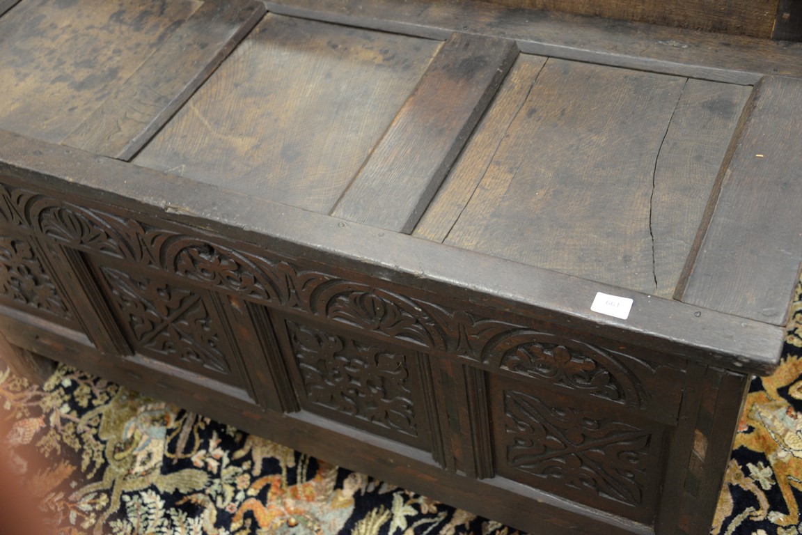 Lot 661: Oak lift top blanket chest with carved panel front, 17th century. ht. 26in., wd. 54 1/2in., dp. 20in.