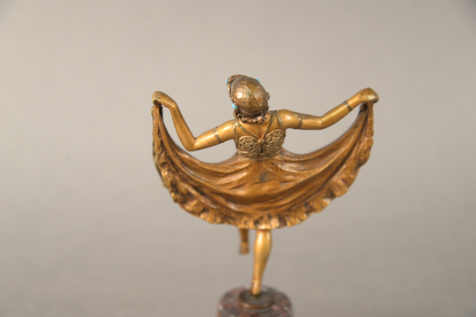 Franz Bergman Austrian, 1898 – 1963, Cold Painted Bronze, naughty gypsy, figure having flip-up skirt, painted and jeweled dress, marked on back, height 7 3/4 inches.