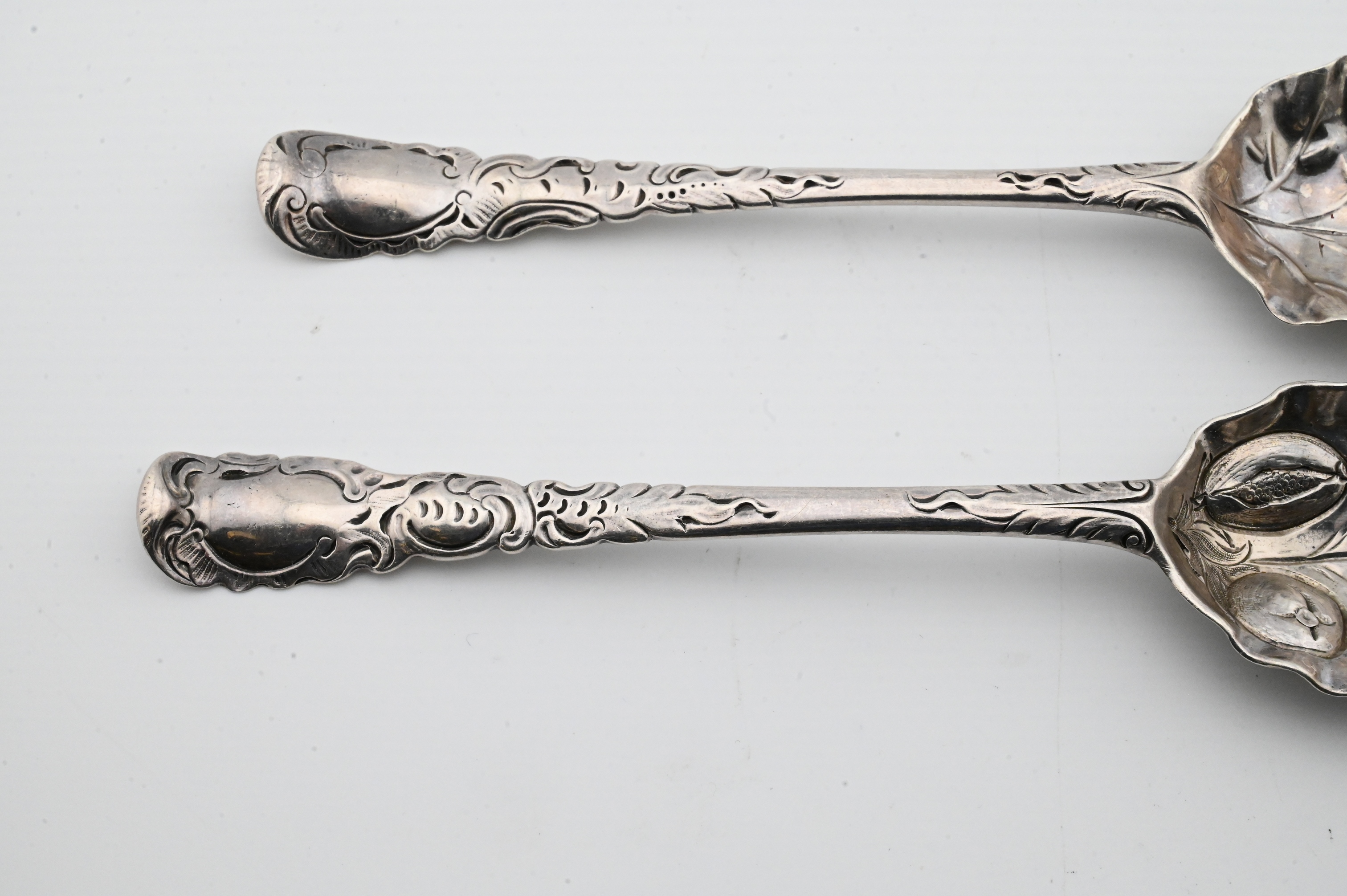 London, Circa Early 1700s (William III / Queen Anne Period), Each with deeply chased leaf-shaped bowl and early Rococo / transitional late Baroque foliate handle, typical of the William III–Queen Anne period, both fully hallmarked on stems, including London lion passant, maker’s marks, and early 18th-century date letters (illegible in photos)