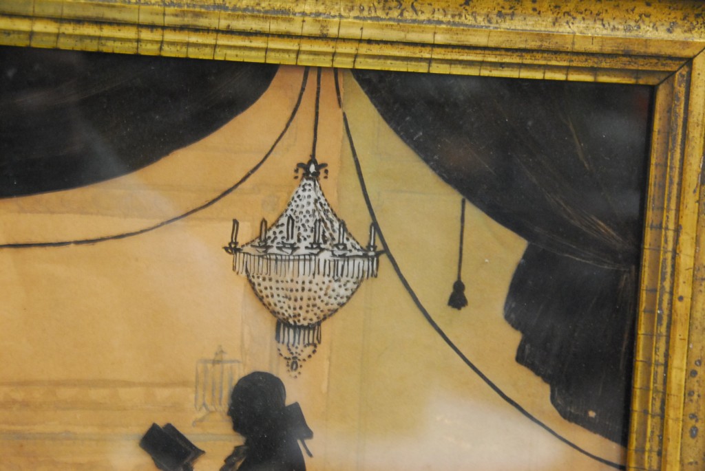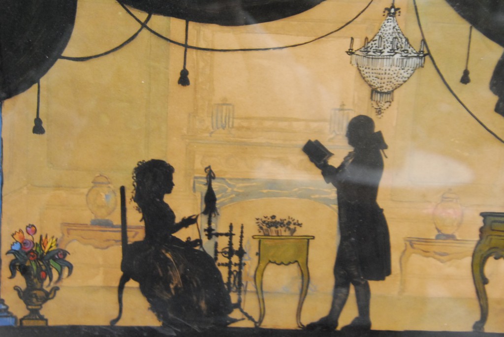 Lot 663: Silhouette reverse painting on glass interior scene with watercolor background. – 11 x 15 1/2