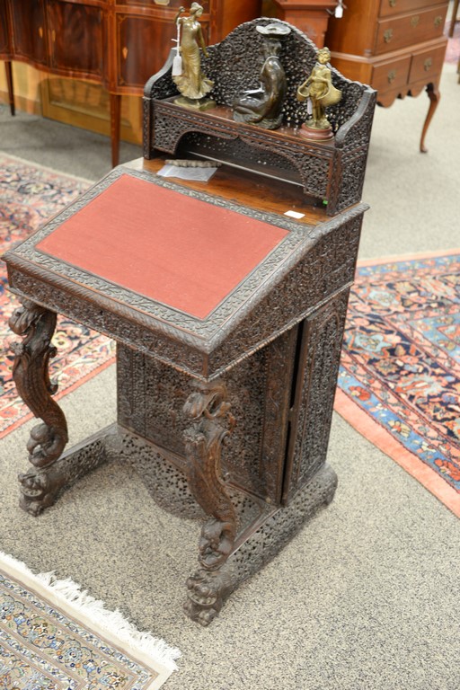 Teak pierced carved Davenport desk having slant lid and carved bird supports on dragon carved base, side with door opening to four drawers. ht. 48in., wd. 24in., dp. 23in.