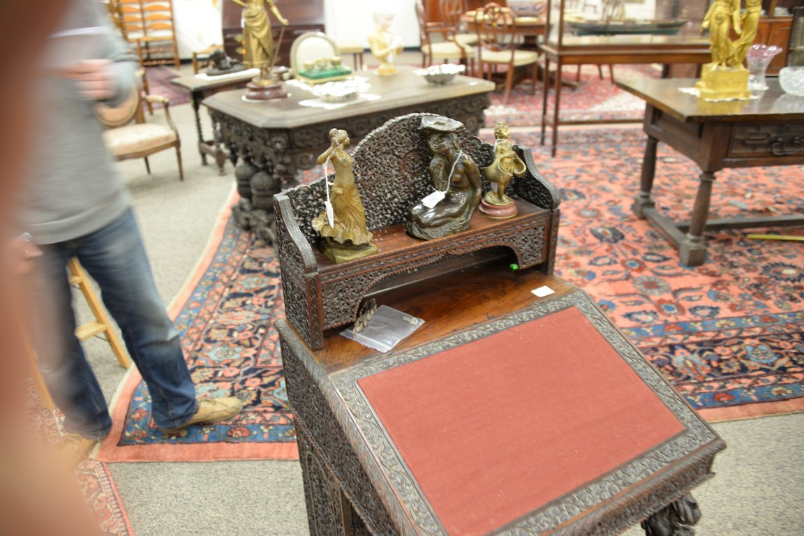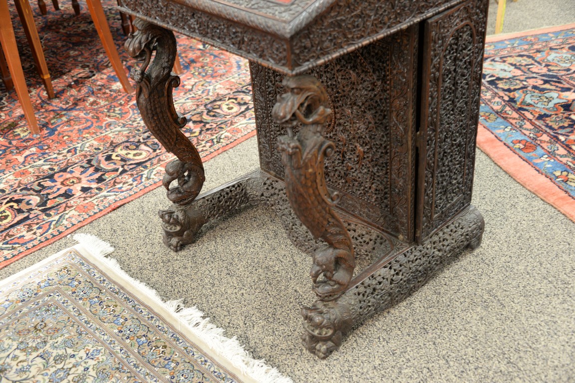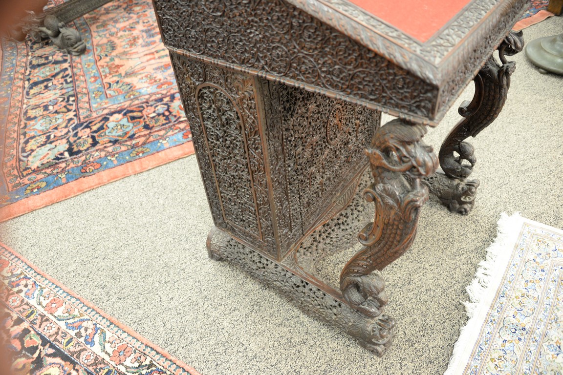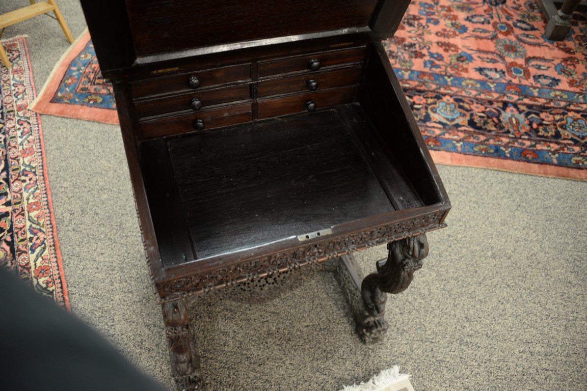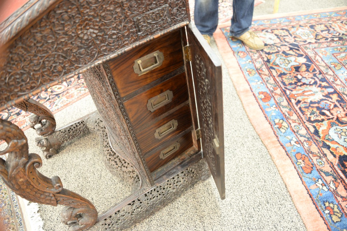 Lot 664: Teak pierced carved Davenport desk having slant lid and carved bird supports on dragon carved base, side with door opening to four d…