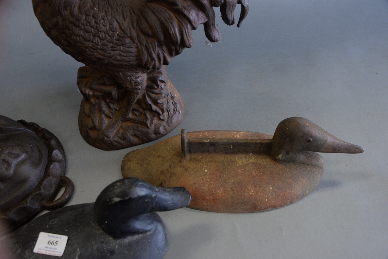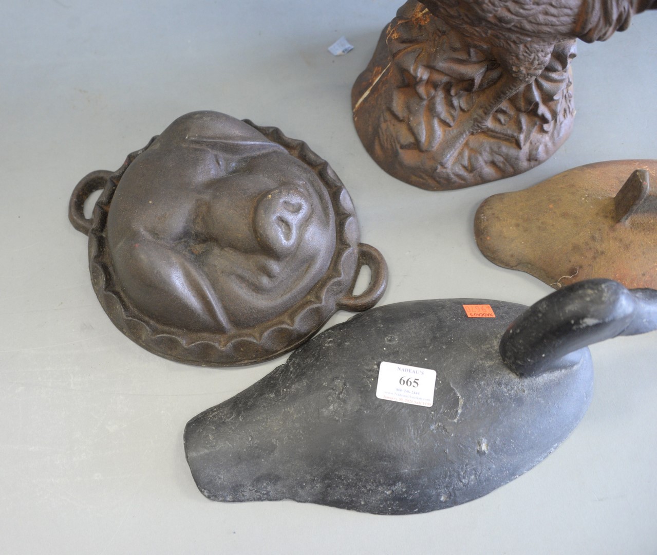 Lot 665: Four Piece Iron Works Lot to include a boot scraper in the form of a duck, a rooster, pig face cake mold, and a duck tallest 16 1/2 …