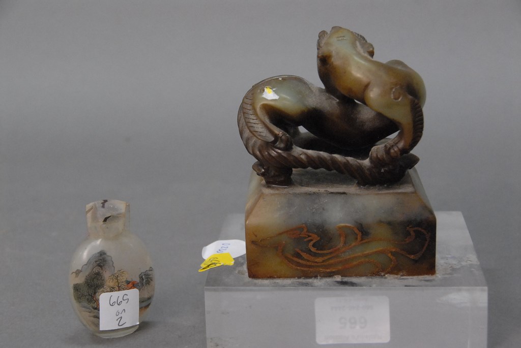 Lot 665: Hardstone foodog seal, green and brown color along with a reverse painted snuff bottle. seal: ht. 4 1/4in.