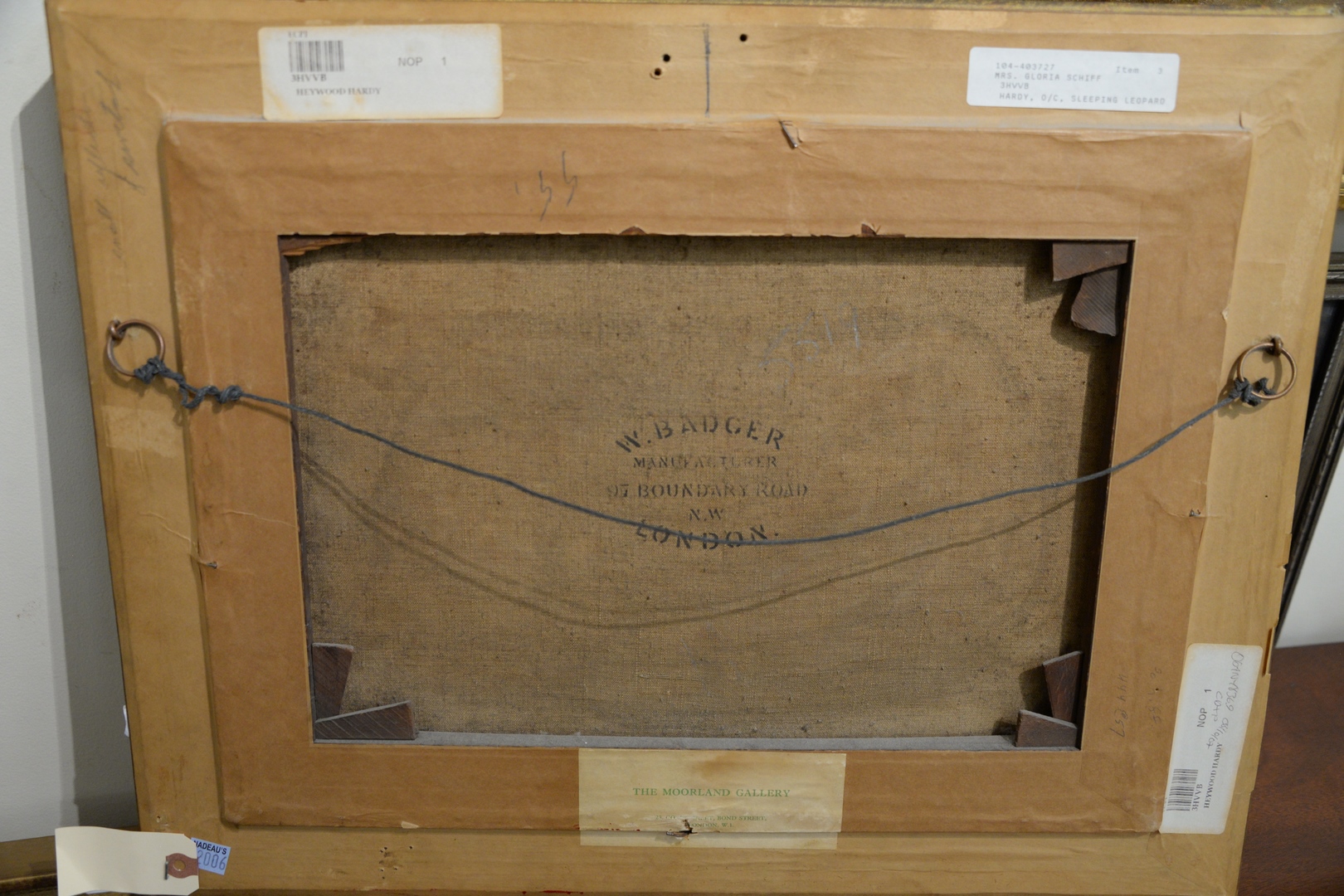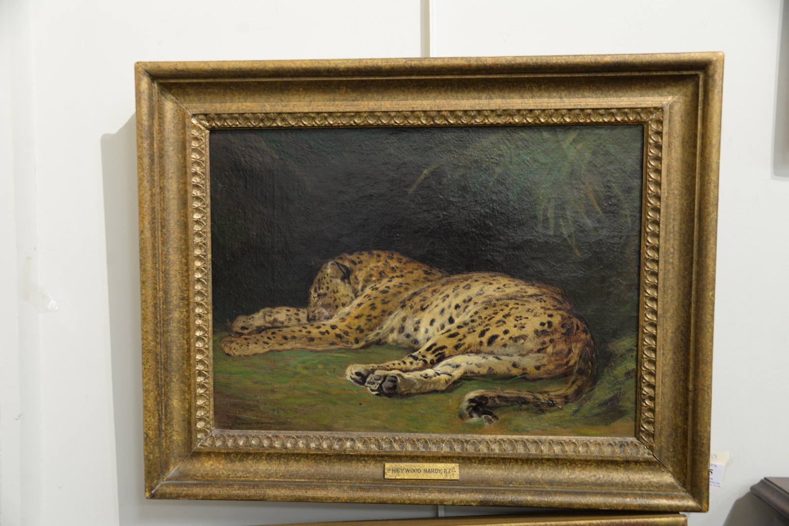 Heywood Hardy British, 1842 – 1933 Reclining Leopard, 1881 oil on canvas signed and dated Heywood Hardy, 1881 lower left 13 1/4 x 18 Provenance: The Moorland Gallery, London label verso: The Estate of Gloria Schiff, 630 Park Avenue, New York