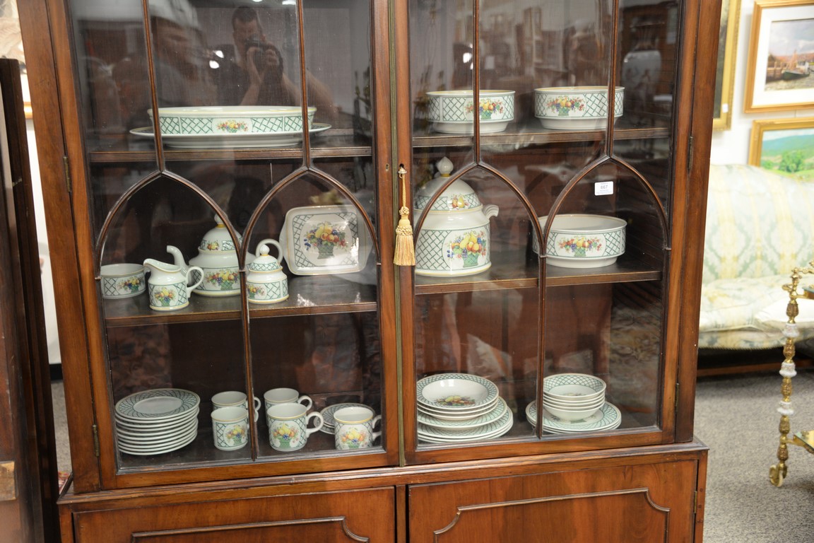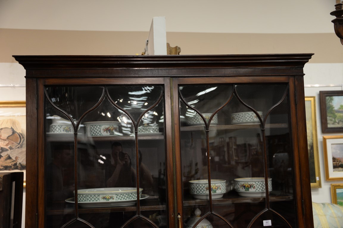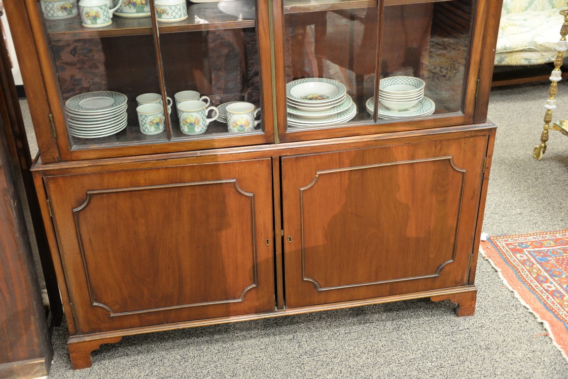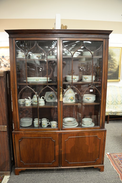 Lot 667: George III mahogany breakfront in two parts, upper portion with arched top glazed doors on lower portion with two doors all set on b…