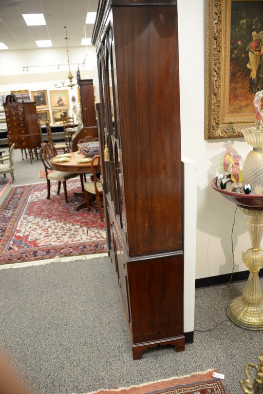 George III mahogany breakfront in two parts, upper portion with arched top glazed doors on lower portion with two doors all set on bracket feet, 19th century. ht. 83in., wd. 54in., dp. 13in.