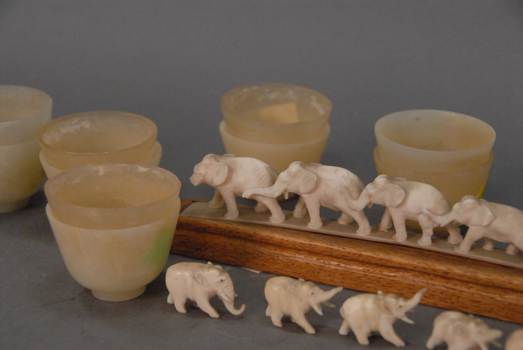 Group lot to include a set of fourteen hardstone cups, soapstone figure neck and head, small train of elephants, and five small elephants.