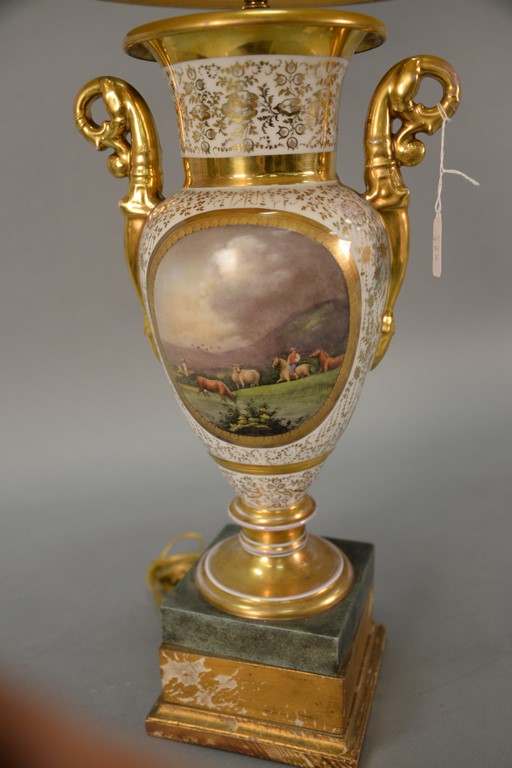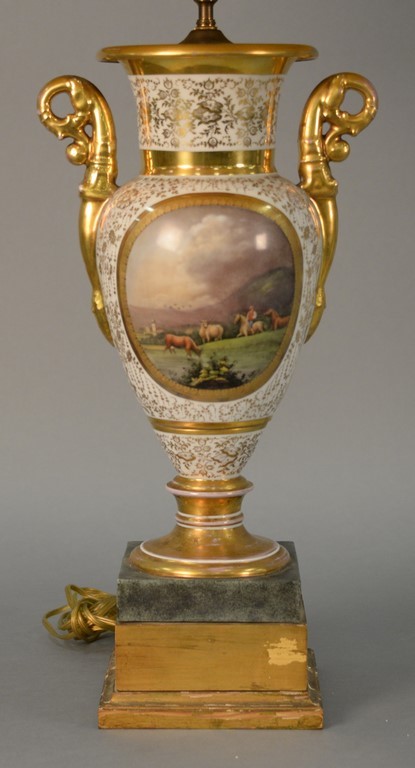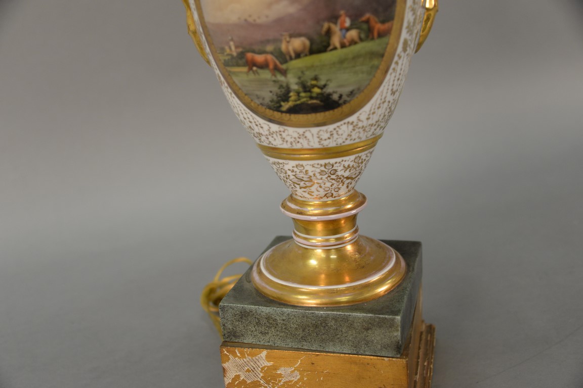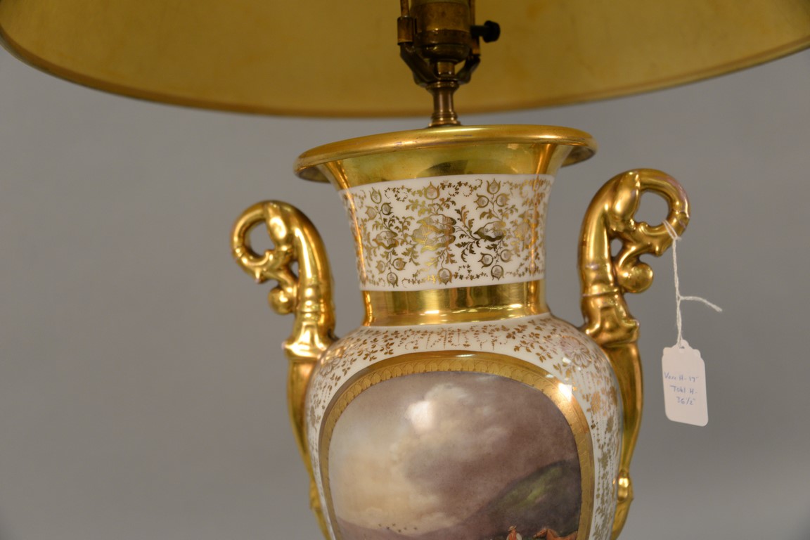 Lot 668: French Porcelain hand painted urn having landscape panel on one side and bust of a girl on the opposite, made into a table lamp. va…