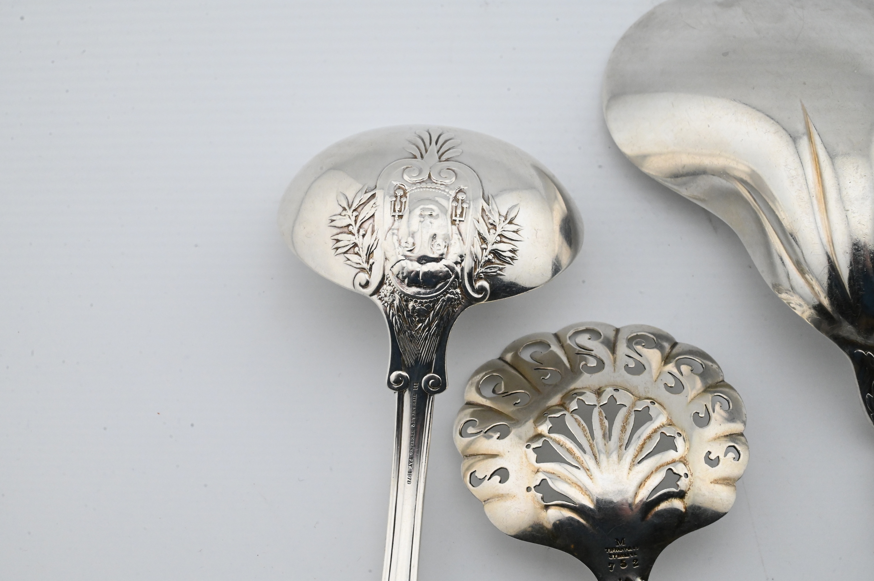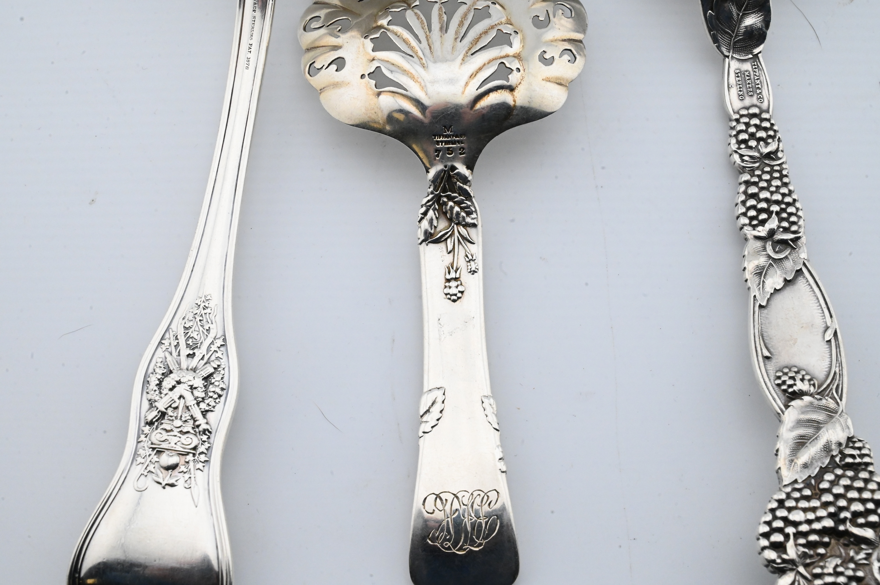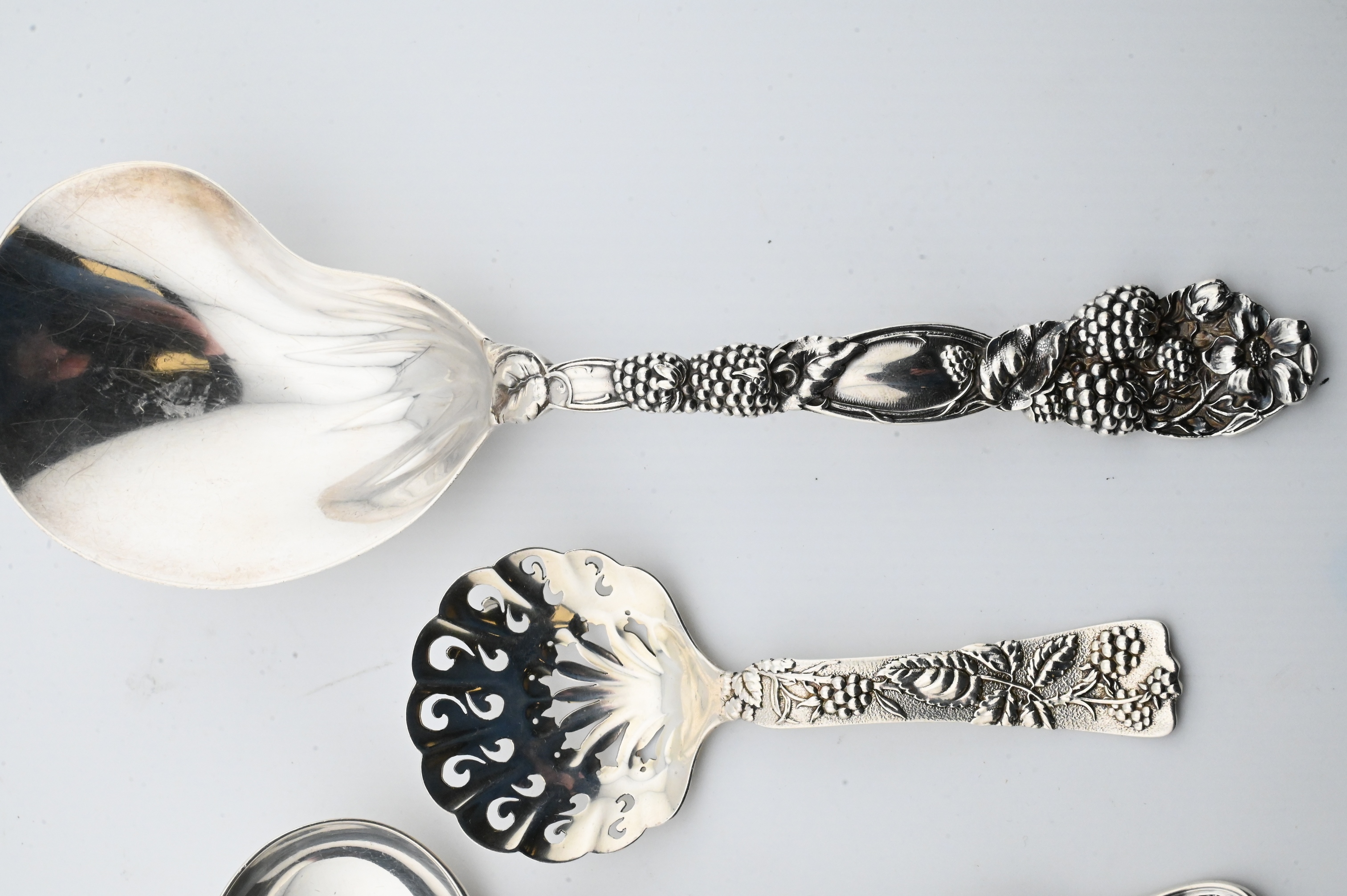 to include an Olympian pattern ladle with mythological figural handle and classical medallion, patented 1878, a Strawberry pattern berry spoon with pierced scalloped bowl and detailed fruiting vine handle (both marked Tiffany & Co. Sterling), sterling silver berry spoon in a Blackberry pattern having a large curled bowl with polished surface, handle cast and chased with blackberry clusters, leaves, and blossoms in high relief, marked TIFFANY & CO. / MAKERS / STERLING / C